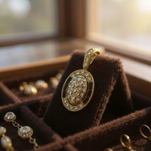 The product is an oval pendant with a gold tone finish, featuring black enamel and crystal accents. The combination of gold tone, black enamel, and crystal stones gives the pendant a luxurious and stylish look that is perfect for both casual and formal occasions. No chain.