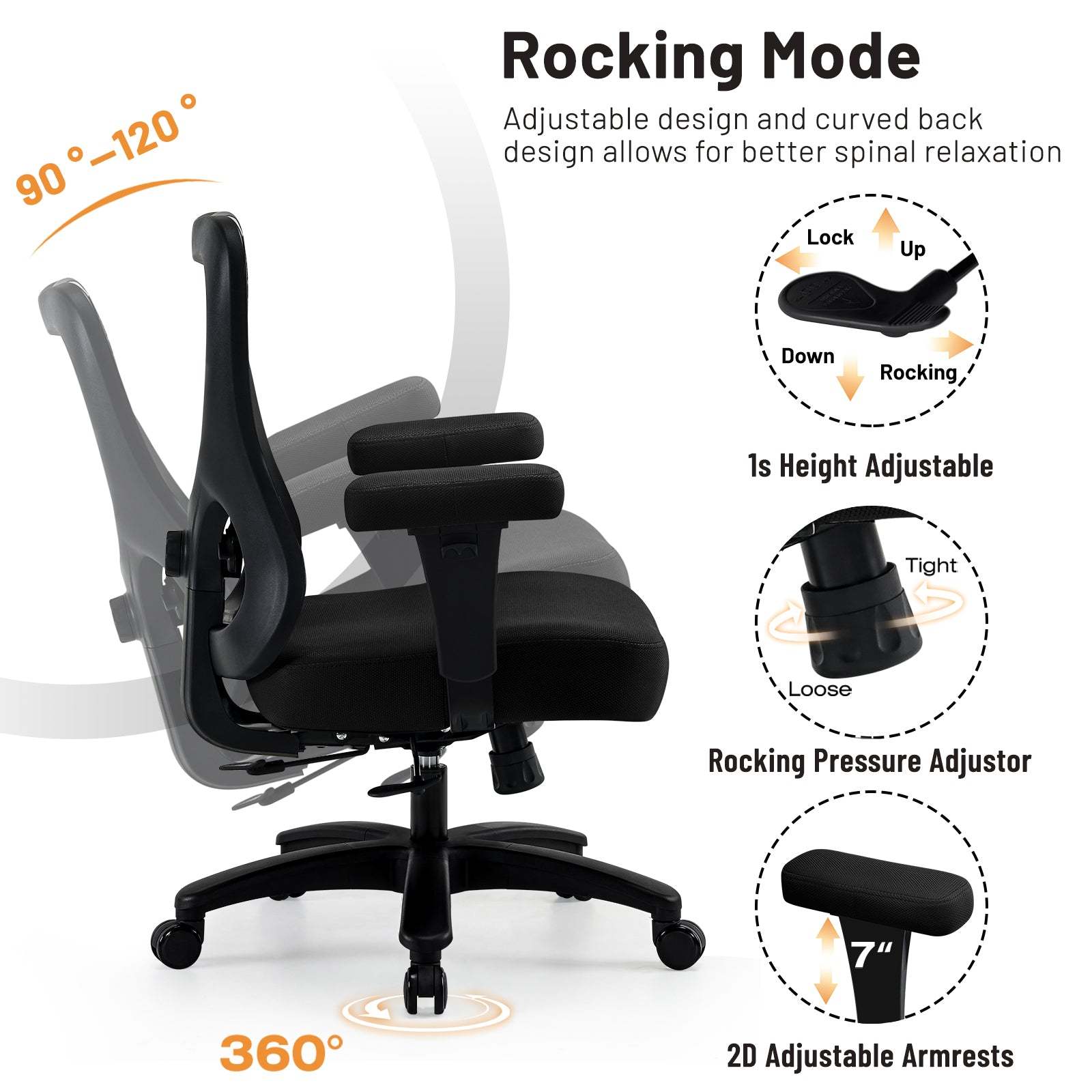 Flexible Adjustments Functions: This desk chair is super versatile! It's got wheels for easy movement, a 360 swivel, adjustable height, and a tilting backrest with a lock feature. it's perfect for people of all sizes. It's super easy to adjust to your perfect position.