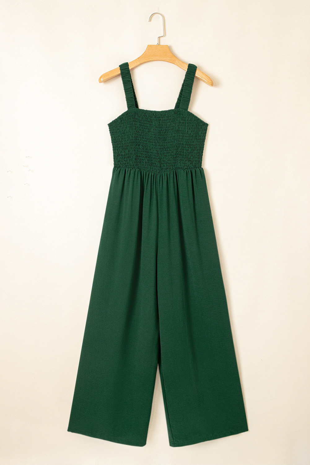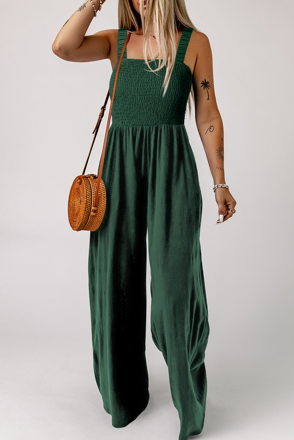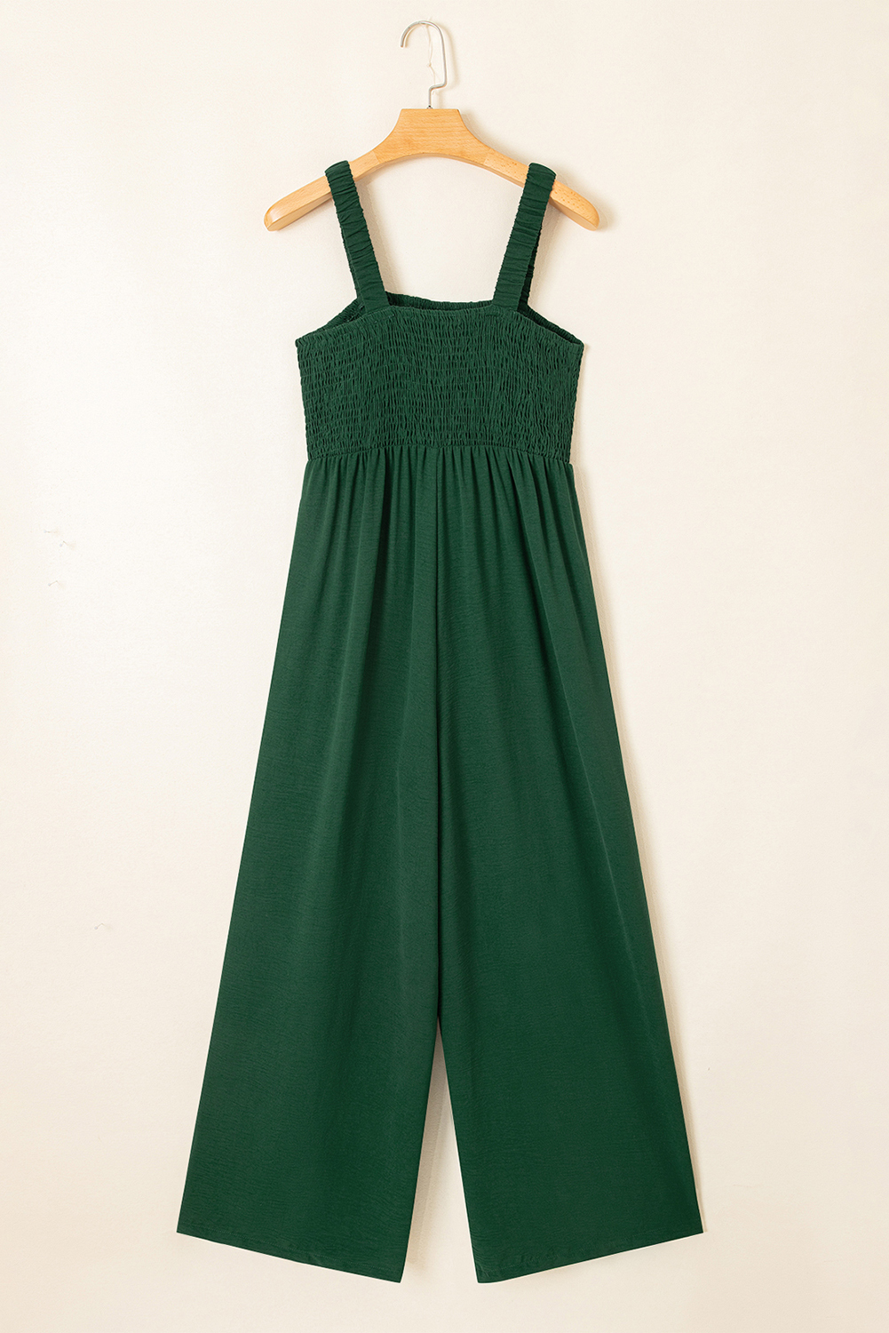 Green Smocked Sleeveless Wide Leg Jumpsuit with Pockets
