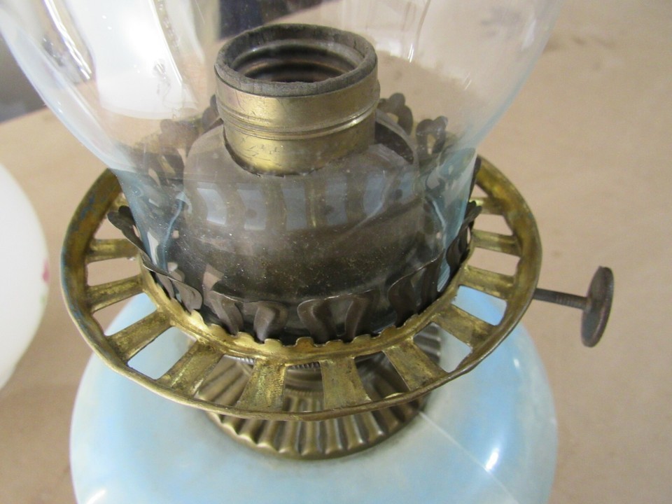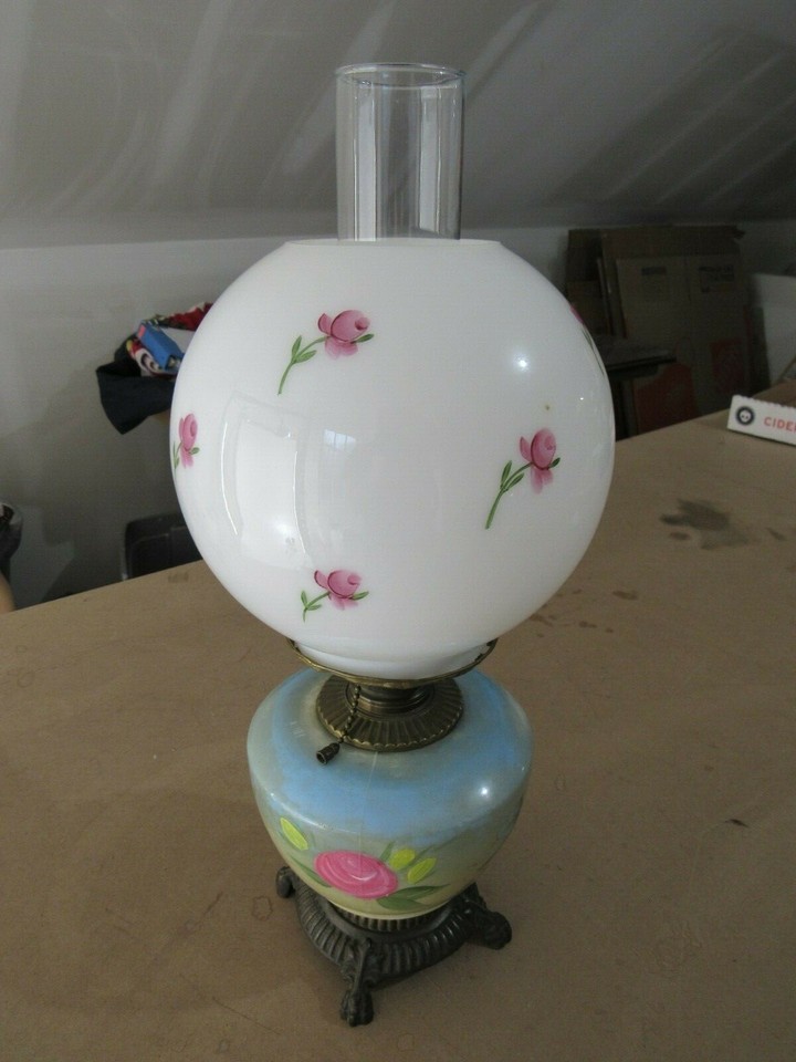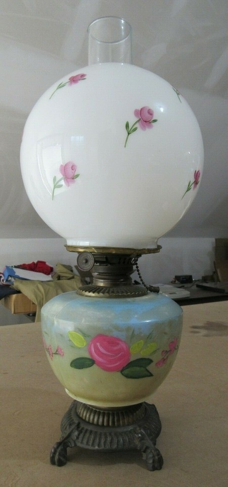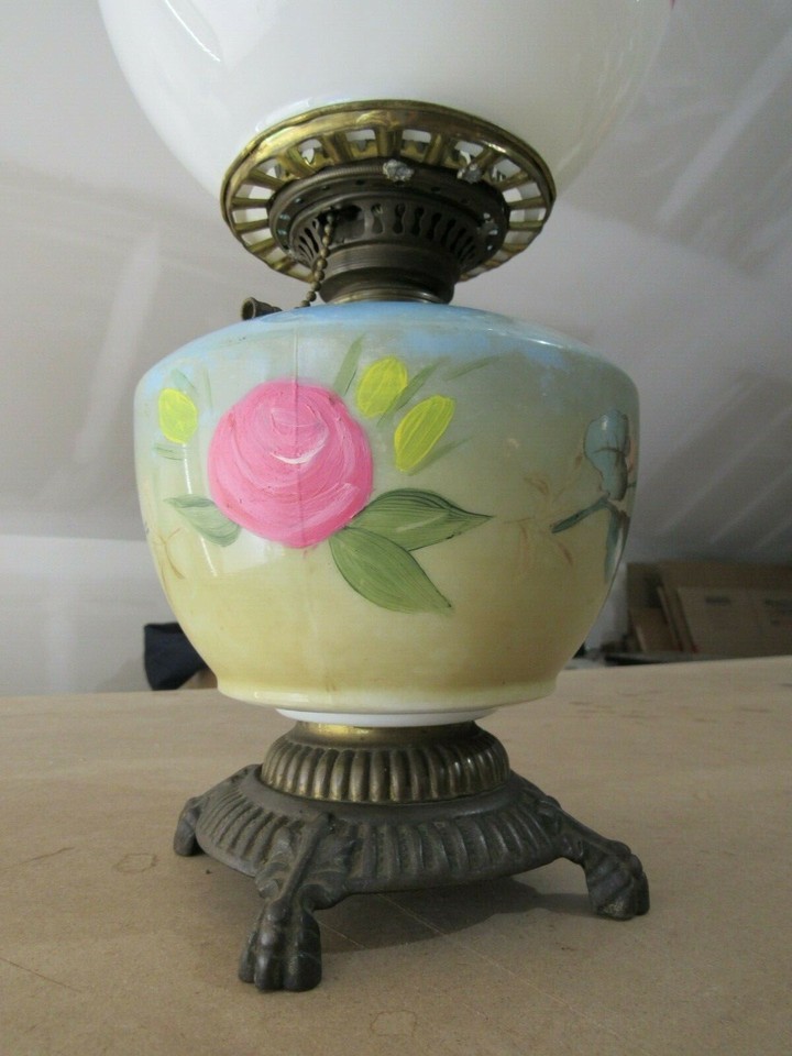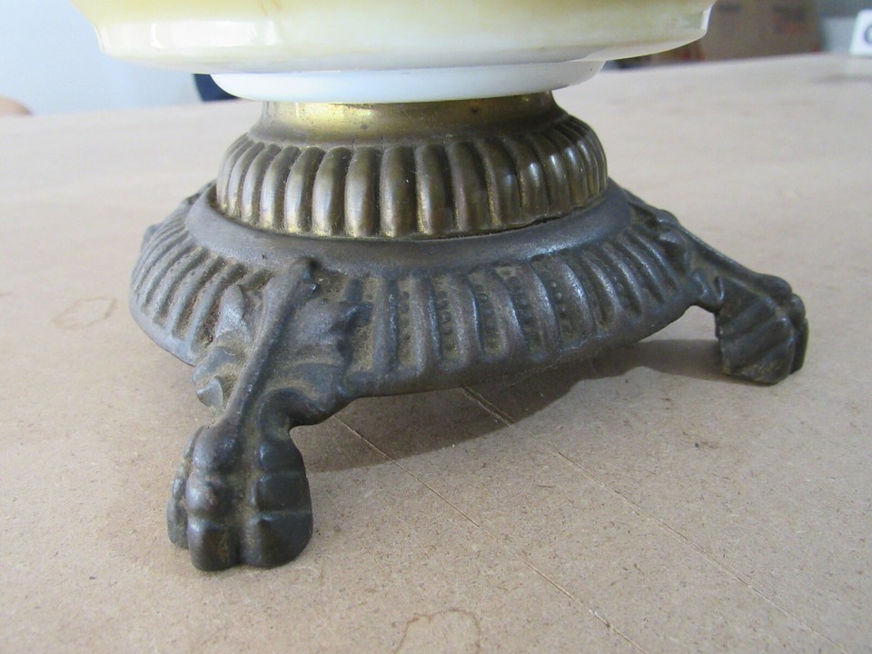 ANTIQUE HURRICANE LAMP gwtw CLAW FEET Flowers milk glass c1910 converted oil