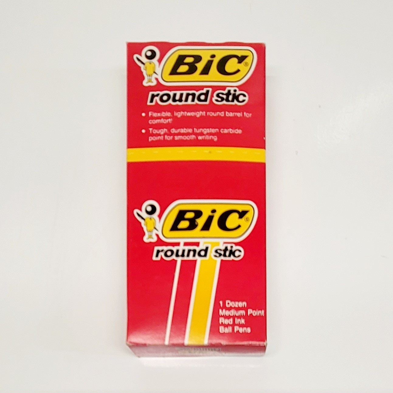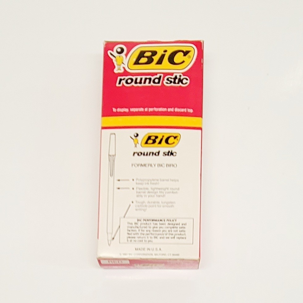 The product is a vintage box of 12 Bic Round Stic Ball Pens from 1987. Made of plastic and featuring red ink, these ballpoint pens are from the United States. Perfect for collectors or those seeking a retro writing experience, these pens offer a touch of nostalgia with their classic design and vibrant red ink.