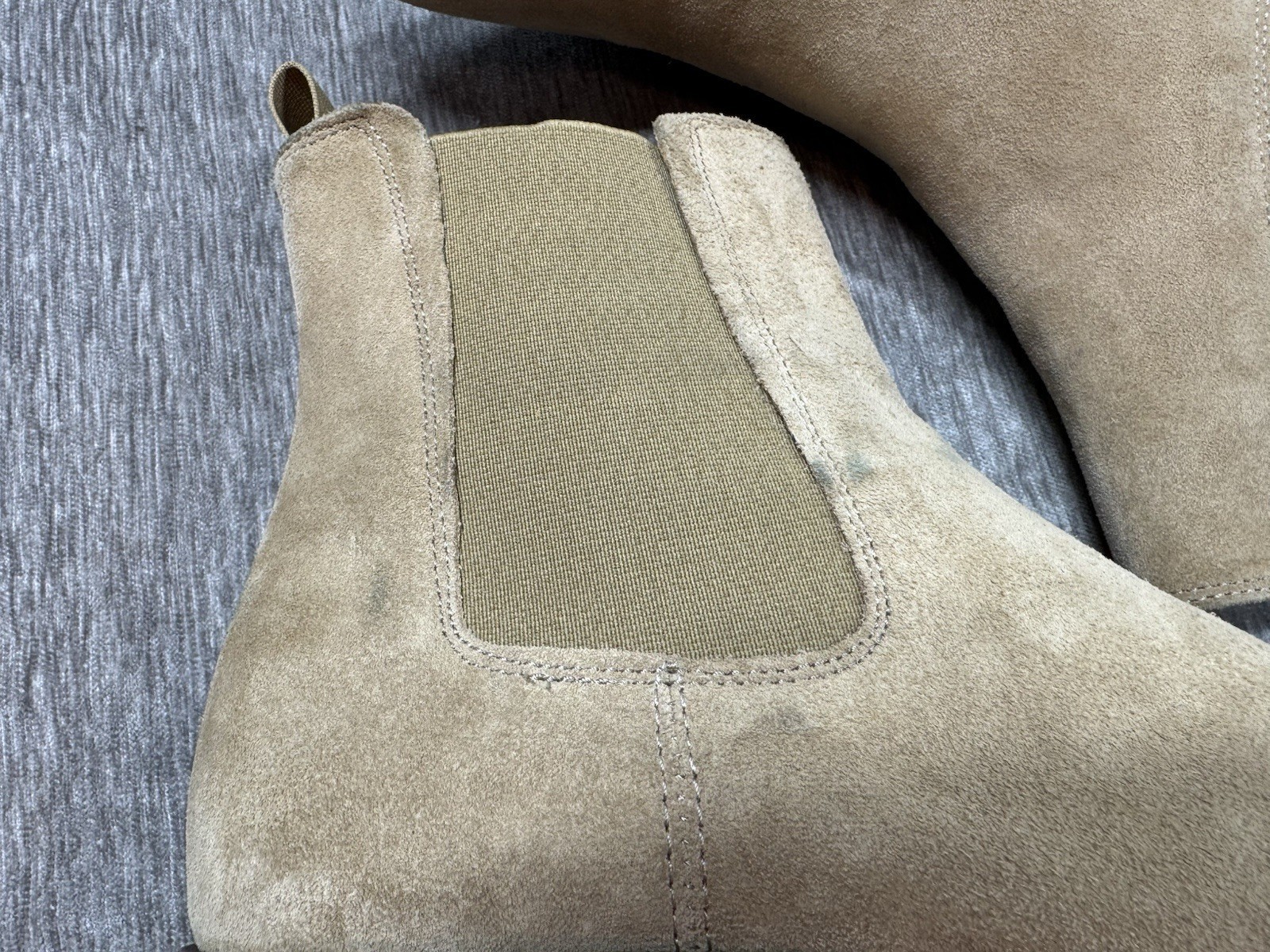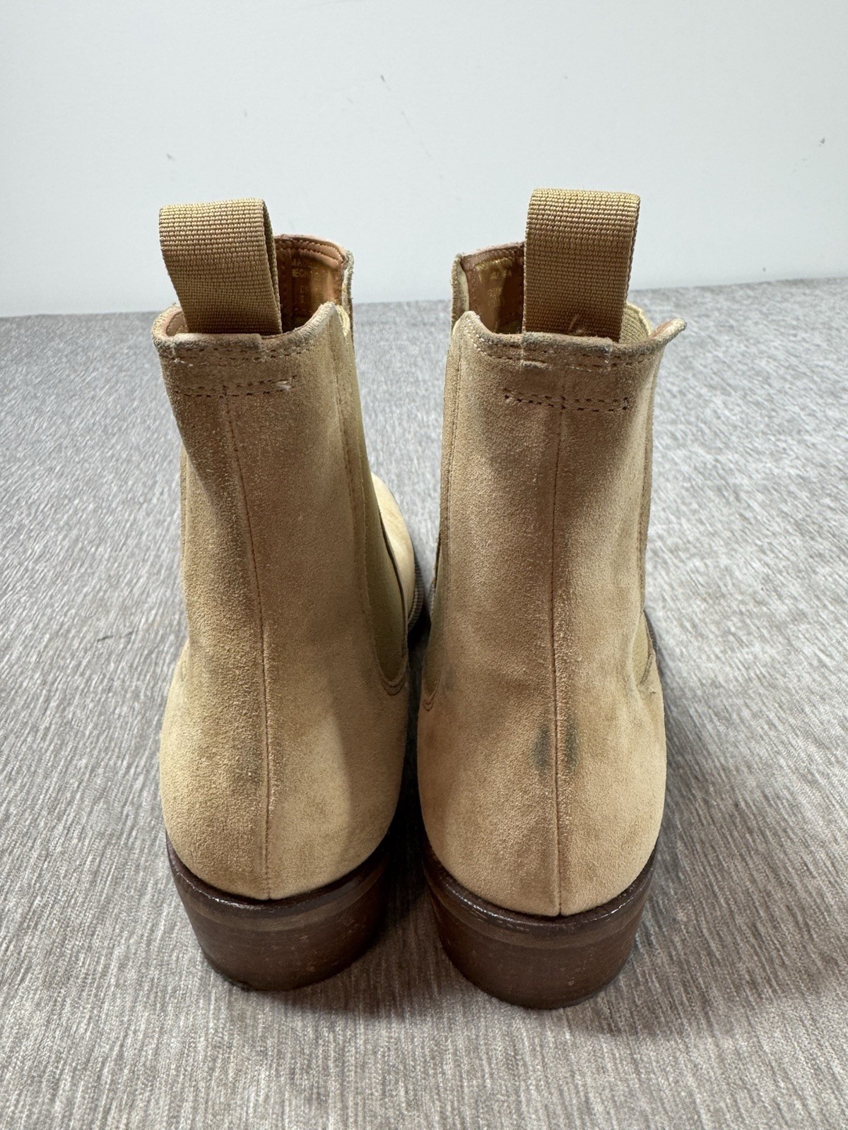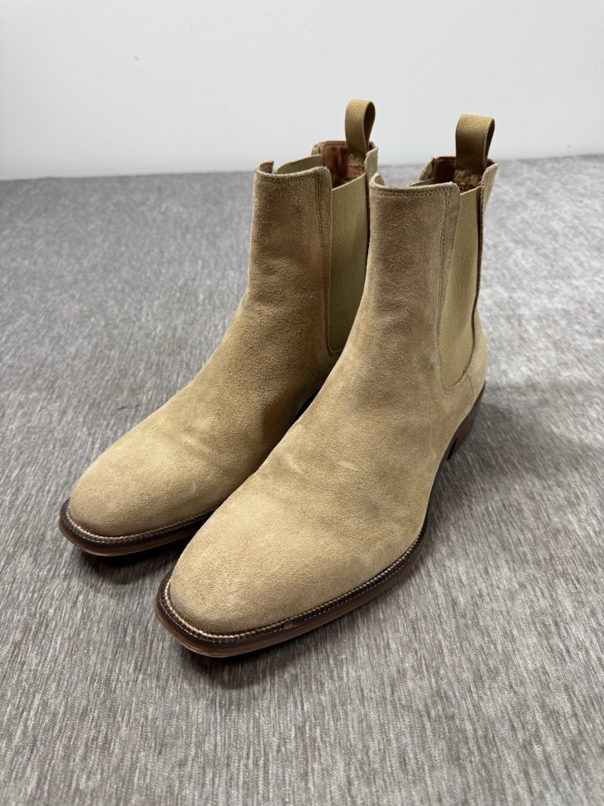 Some normal wear on the suede including some areas of discoloration, see photos. No rips or tears.