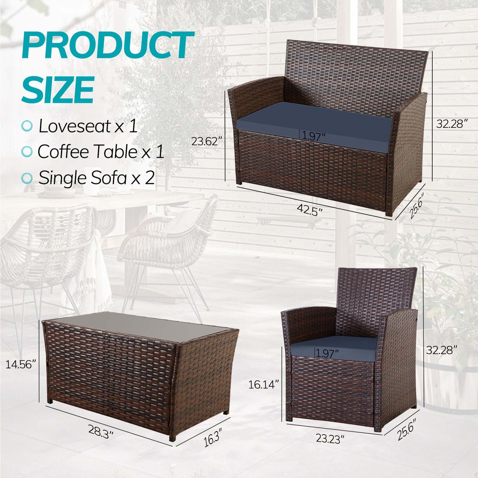 STURDY DURABLE MATERIAL: Our patio furniture set is made of premium PE rattan wicker and rust-resistant steel frame which are strong enough to withstand all weather variations; The seat and back cushion covers made of high-density fabric which is durable and anti-splashing