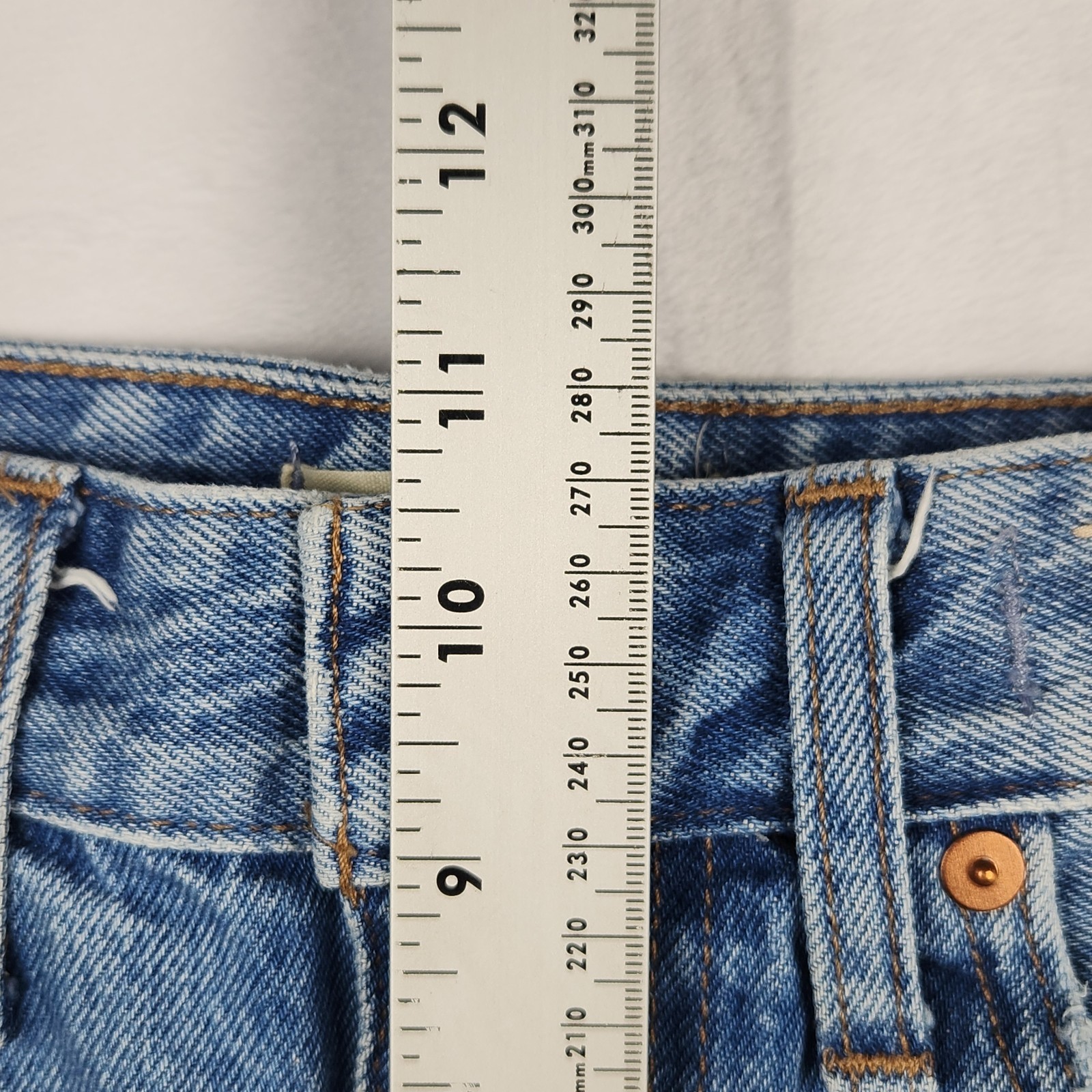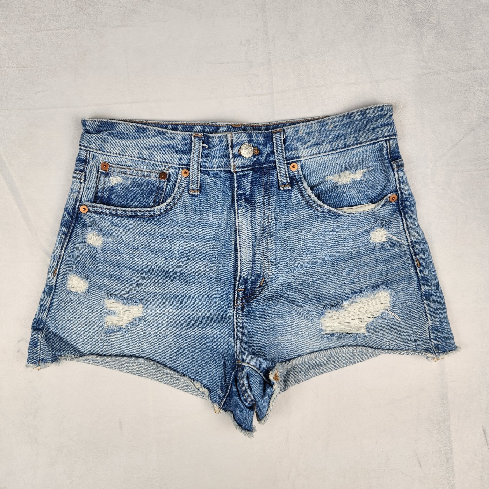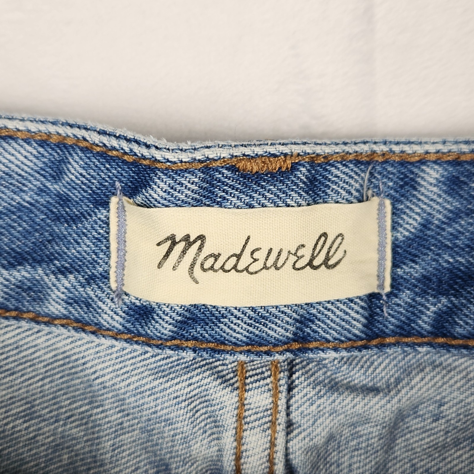 This product is a pair of Madewell women's shorts in size 25, featuring a relaxed denim short style in a distressed blue color. The shorts have a solid pattern, zip closure, and are made from 100% cotton denim fabric. They are designed for casual occasions with a medium wash and high rise. The shorts also include accents like buttons, zippers, and the Madewell logo, and have a comfortable and stretchy fit with pockets for added convenience. Perfect for outdoor or classic-themed styles in the summer, fall, or spring seasons.