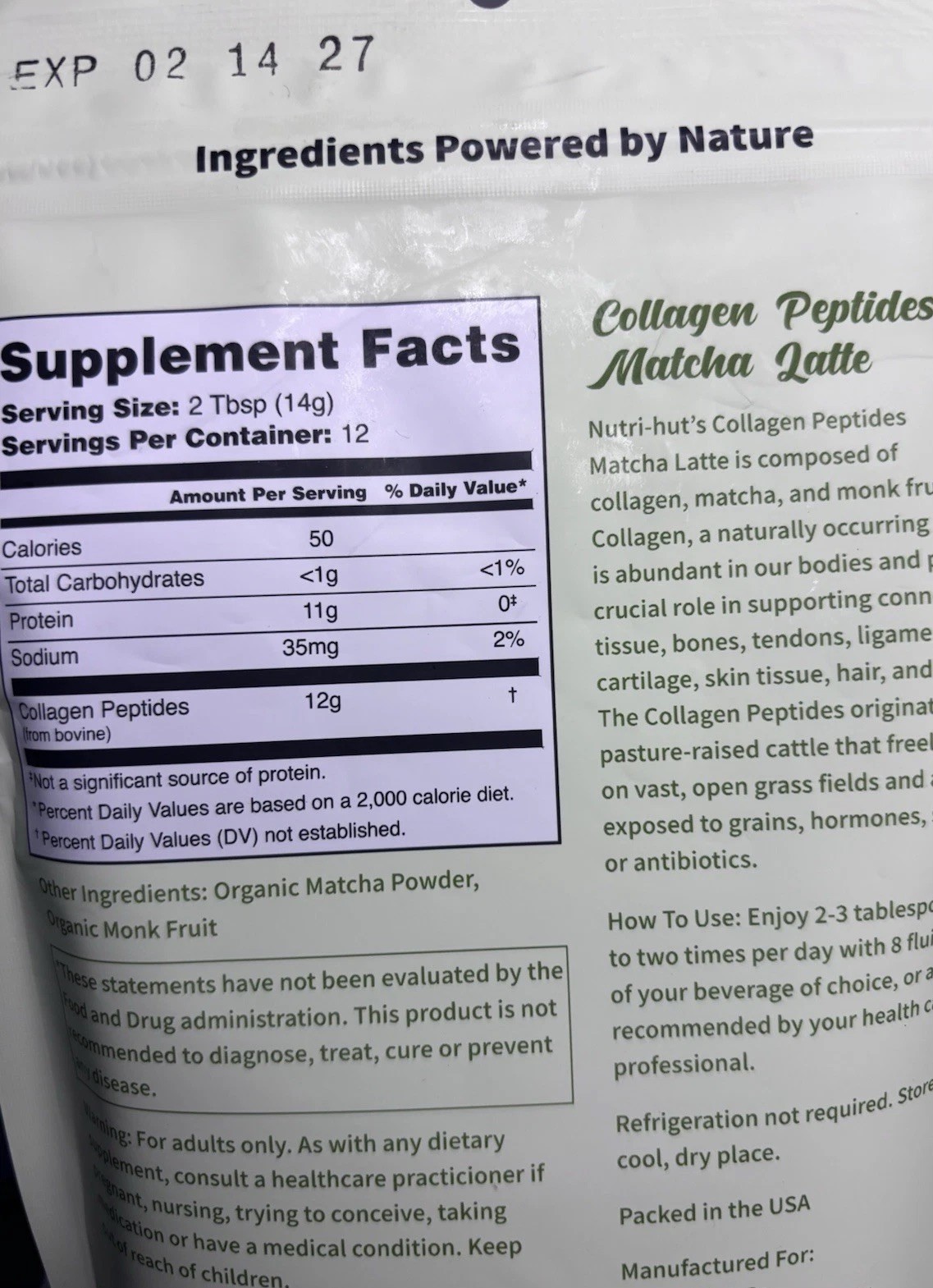 Nutri-hut COLLAGEN PEPTIDES MATCHA LATTE DAIRY FREE NON GMO 6 OZ.