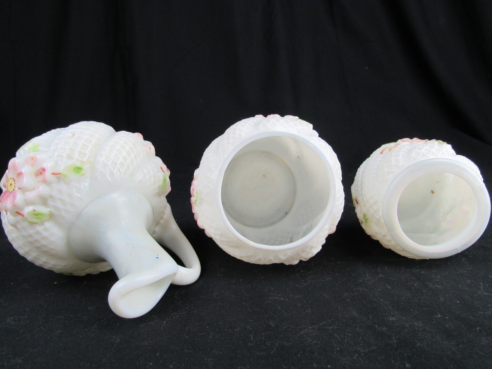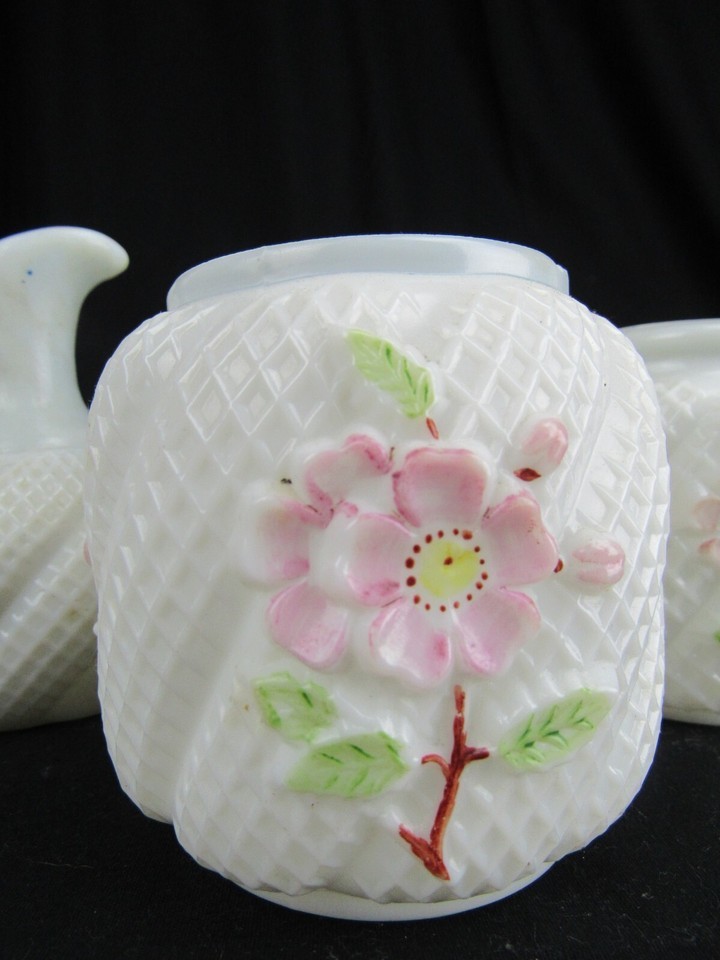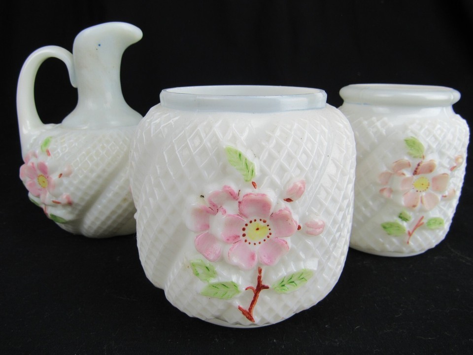 Antique three piece set. I believe these are Northwood Apple Blossom Pattern. I am not 100% what each piece is for. Sugar, creamer, etc. ? Please use your best judgement.
