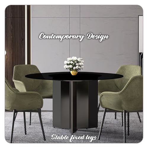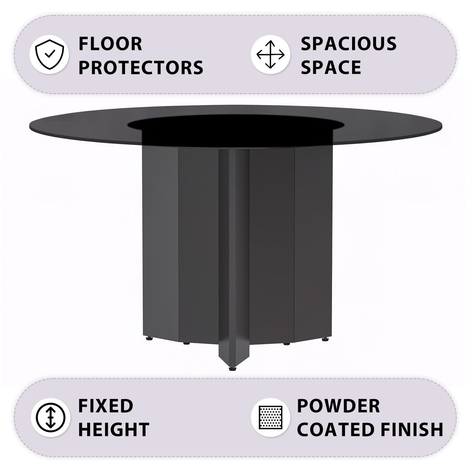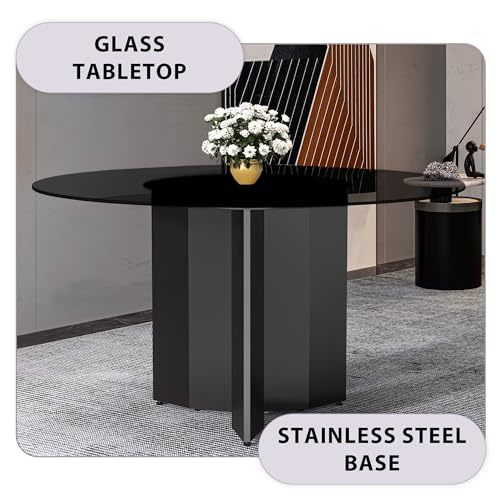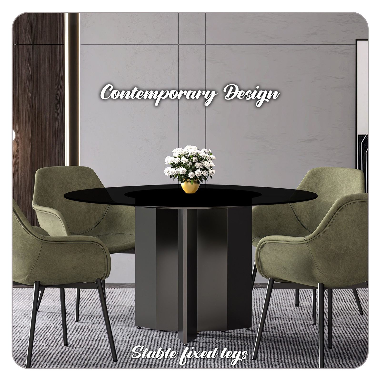 Bullet point: Immerse yourself in the perfect blend of style and practicality with the Zevro modern dining table. This exquisite piece effortlessly combines mid-century charm with modern flair, resulting in a stunning fusion of aesthetics. The gracefully designed steel base not only adds visual interest but also ensures stability and durability for long-lasting use. Paired with a spacious round tabletop crafted from premium glass or sintered stone. Elevate your home decor effortlessly with its chic and versat