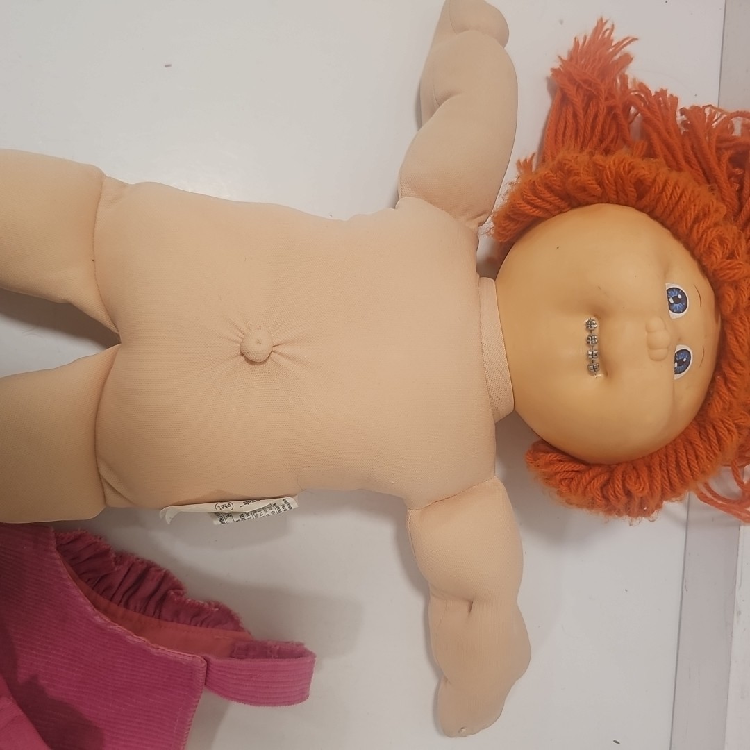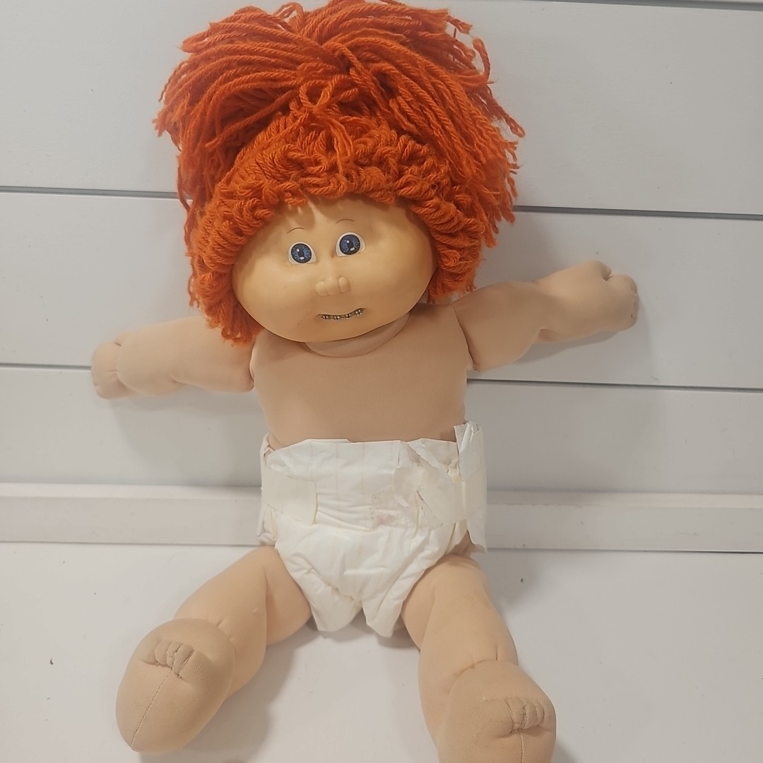 The product is a vintage Cabbage Patch Doll by Xavier Roberts, featuring red yarn hair and blue eyes. This boy doll from the 1980s comes with real braces and a light complexion, making it a unique and collectible addition to any doll collection. Perfect for play or display, this classic doll is a must-have for fans of vintage dolls and nostalgic toys from the 1980s.