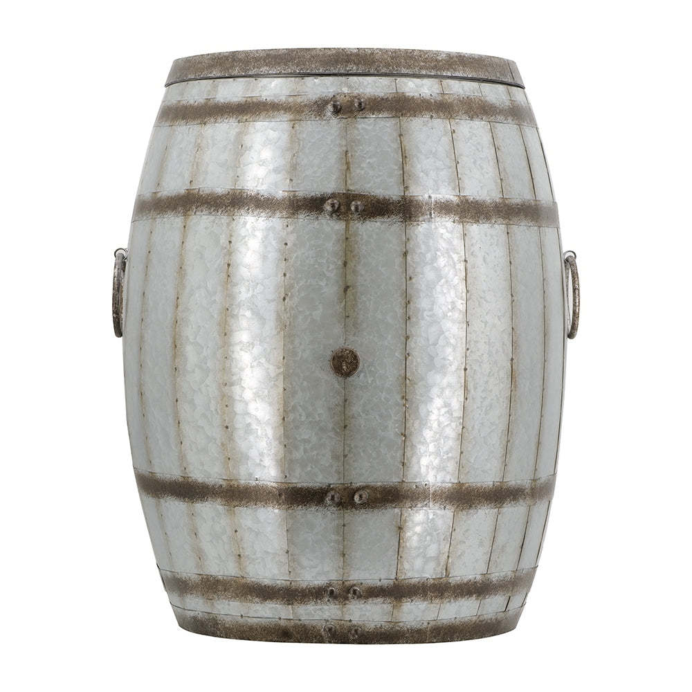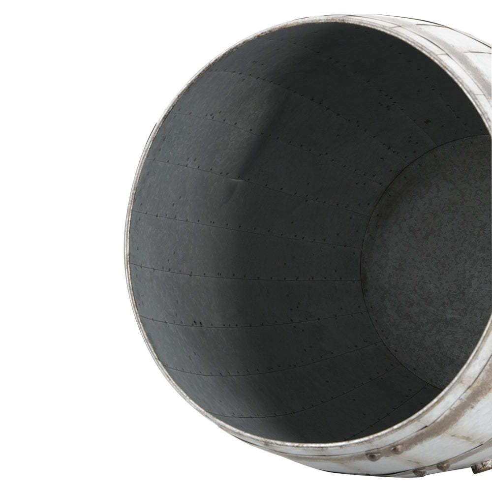 Featuring drum shape in a galvanized gray finish and accented with rustic brown banding and rivet, its hollow figure offers spacious storage.