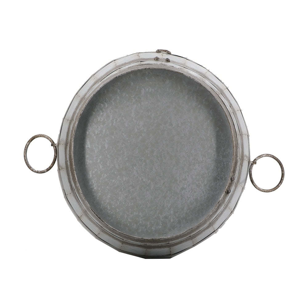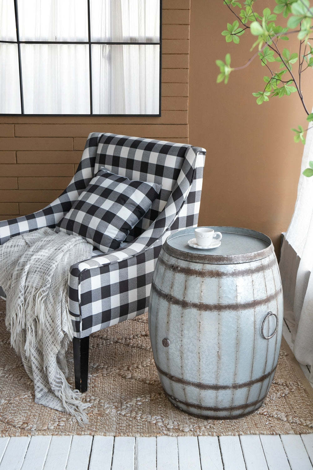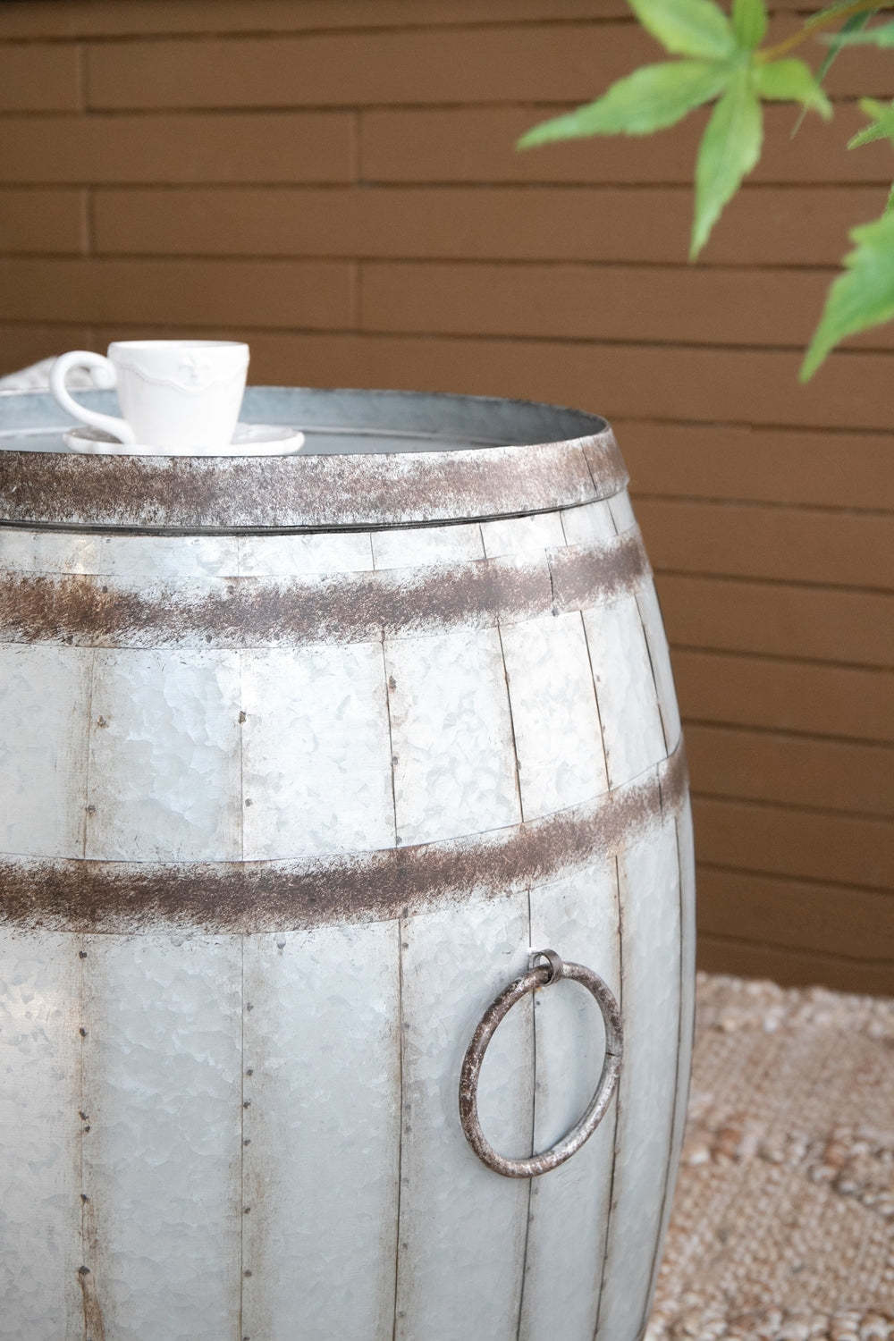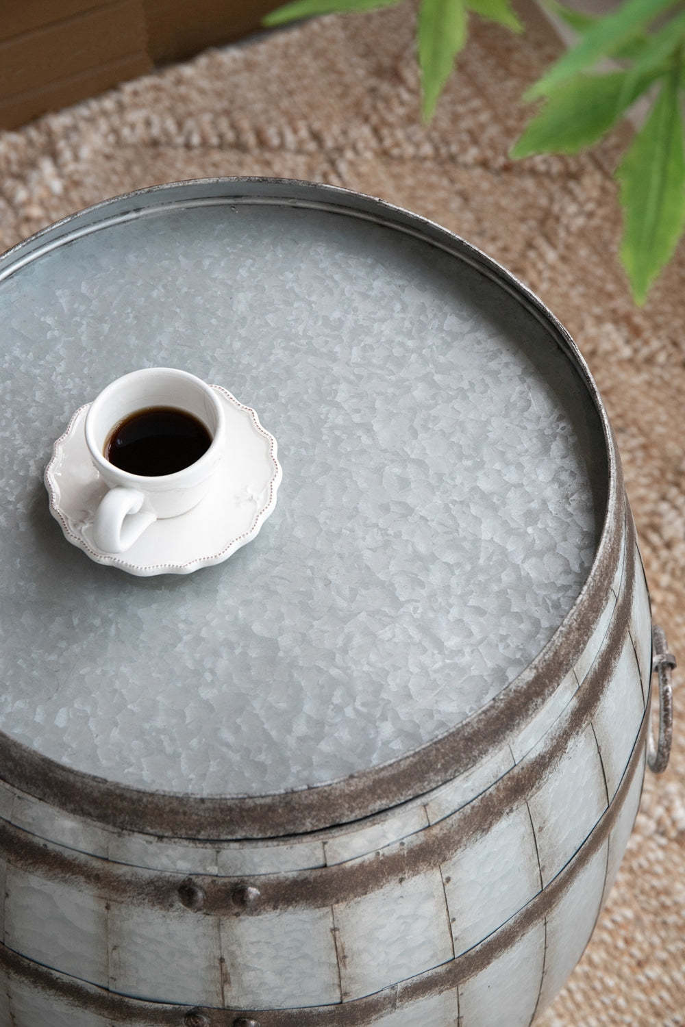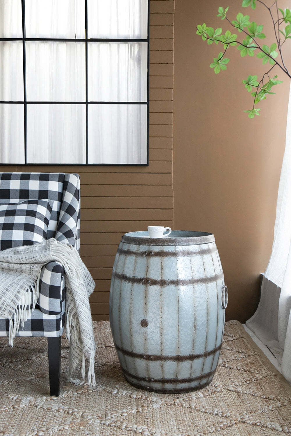 Bring this stylish yet functional table home to create space saving storage and reflect a rustic style as well. Featuring drum shape in a galvanized gray finish and accented with rustic brown banding and rivet, its hollow figure offers spacious storage. The lid is removable and acts like a tray when needed.