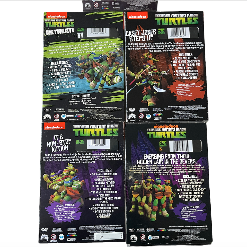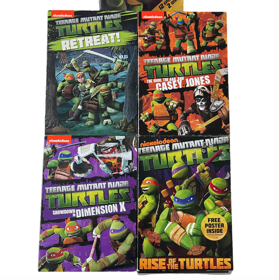 Lot of 5 DVDs TMNT Nickelodeon. Tested and very good condition. One outer cover has marks on it and one inside plastic holder is broken. Includes: Retreat (has outer cardboard cover) 2014, Rise of the Turtles (Cardboard cover has marks on it) 2012, Showdown in Dimension X - 2 discs in case (cardboard case has sticker residue and plastic holder inside is damaged) 2014, The Good, The Bad, and Casey Jones (cardboard cover) 2014, Ultimate Showdown (no cardboard cover) - 2 discs in case 2013. 7 DVD's total altogether. Please see all photos. We are a smoke free, pet friendly home. Have a great day!