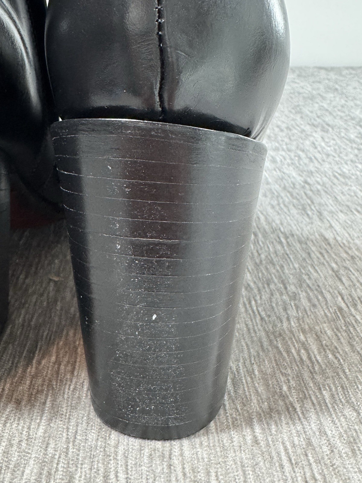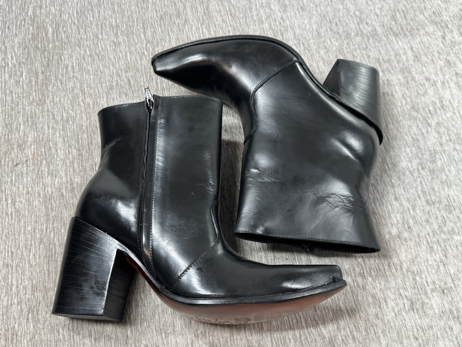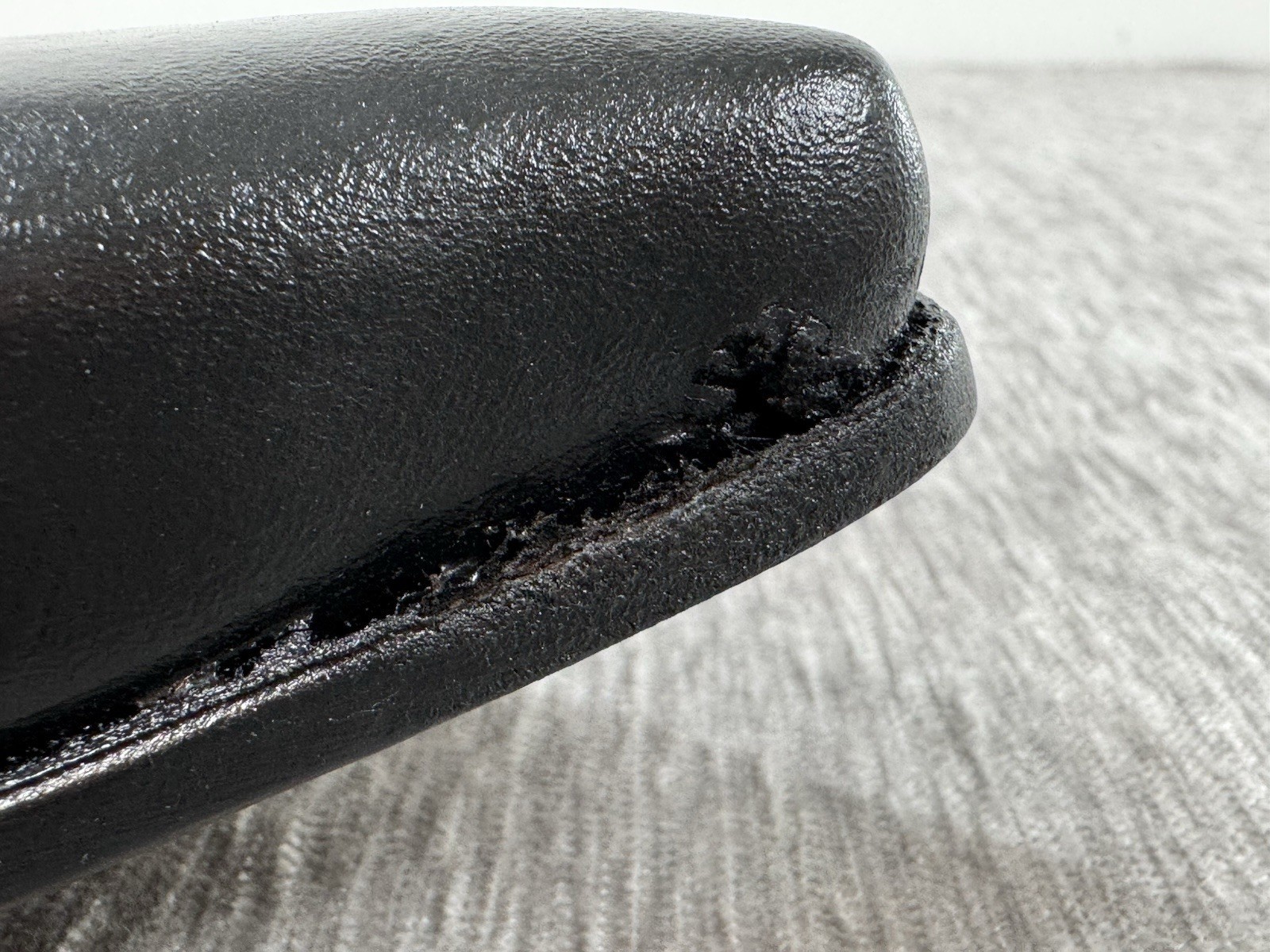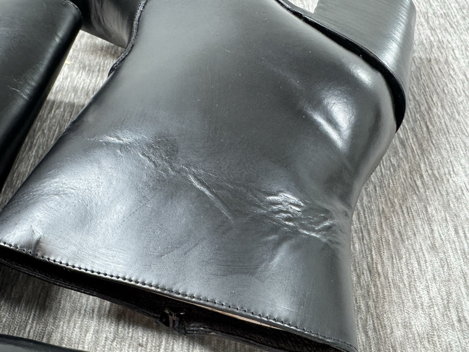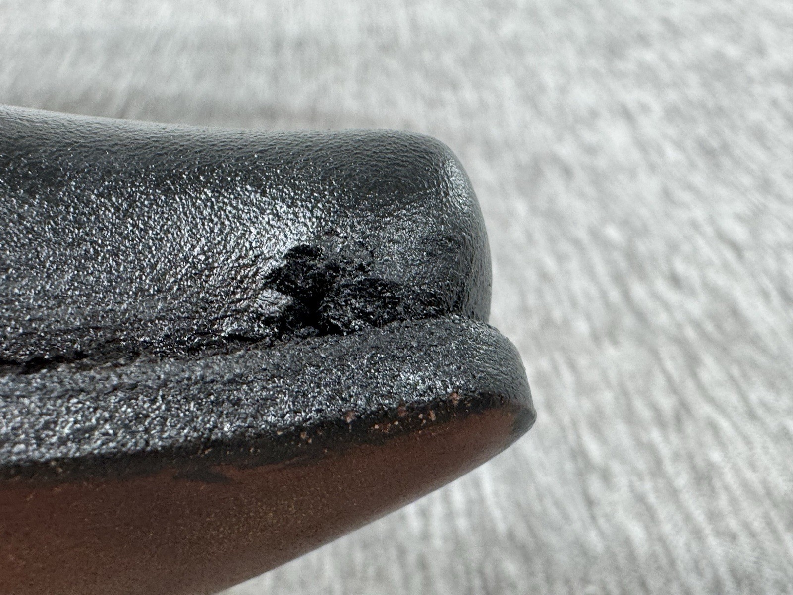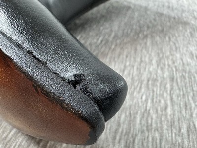 Appear almost never worn, but I think there is a small factory defect in the leather by the left toe. See photos. It looks like a small hole, but it is solid and intact. There are some creases int he leather as well.