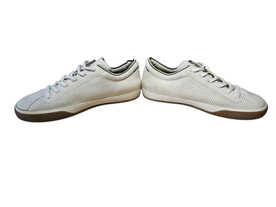 Rothy's Off White Neutral Knit Lace Up Trainer Shoes Sneakers in size 10 are a stylish and versatile choice for women. These sneakers feature a round toe shape, lace-up closure, and a comfortable flat heel. Made from breathable knit fabric with a cushioned insole, they are perfect for casual wear, workwear, or even travel. The ivory color and quilted logo accents add a touch of modern flair to the classic sneaker style, making them a timeless addition to any wardrobe.