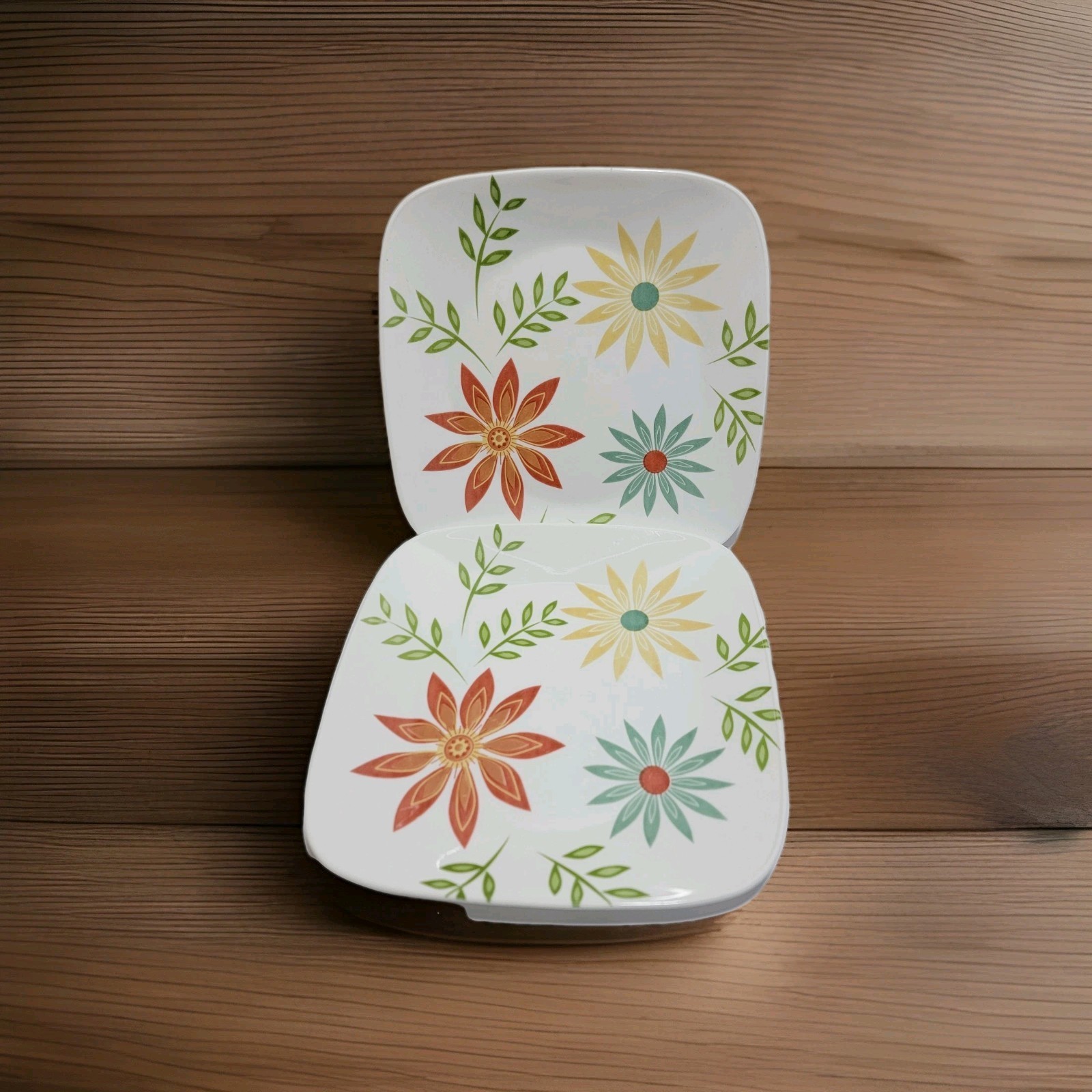 These are 2 Corelle "Happy Days" square dinner plates, known for their floral design and chip/break resistance.