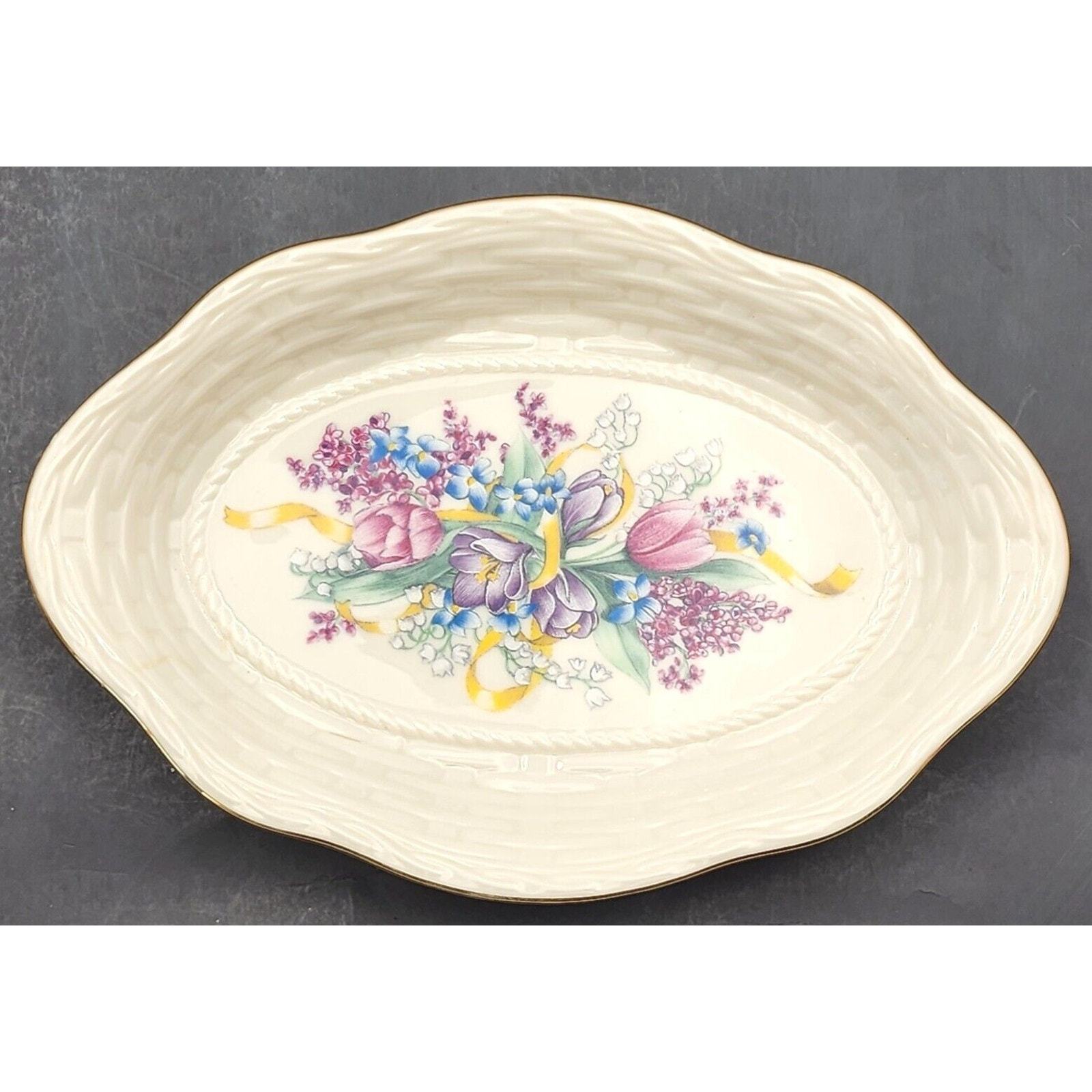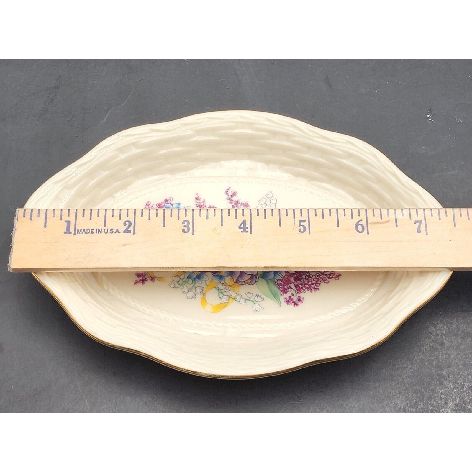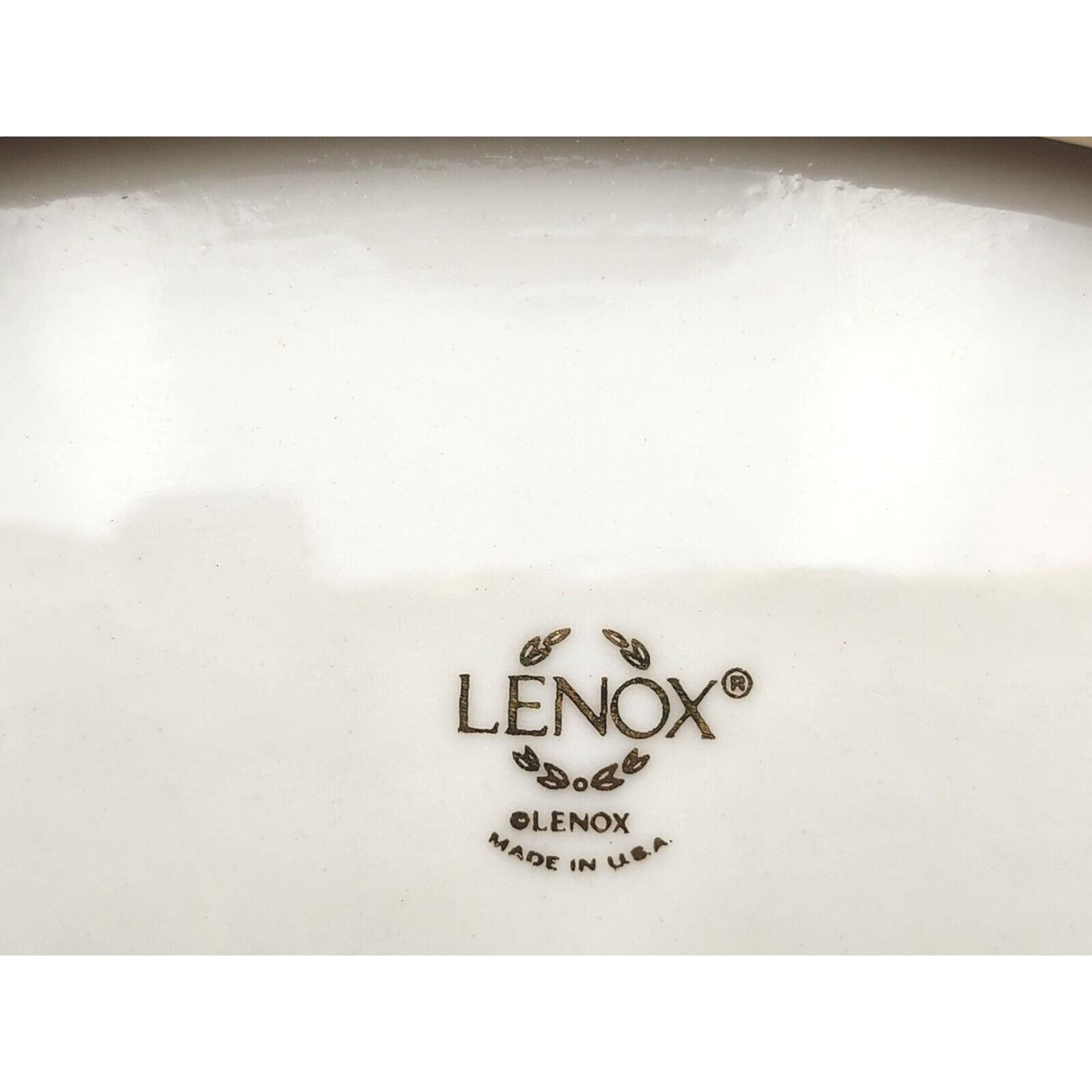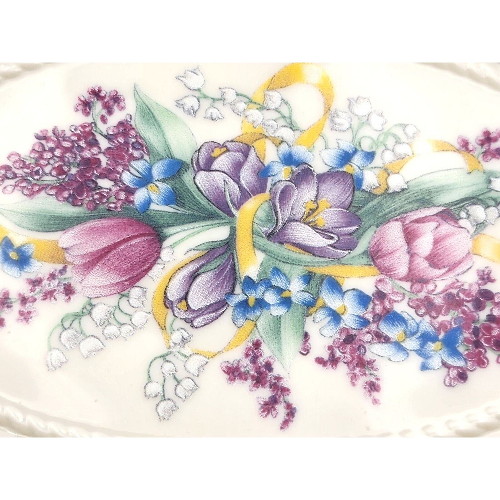 This Lenox candy dish from the 1980s is a rare vintage find that will add a touch of elegance to any space. The oval dish is decorated with purple flowers and a yellow ribbon, making it a beautiful decorative piece for display or for serving candy and other small treats. Crafted from fine China and with a painted backstamp, this dish is a unique addition to any collection.