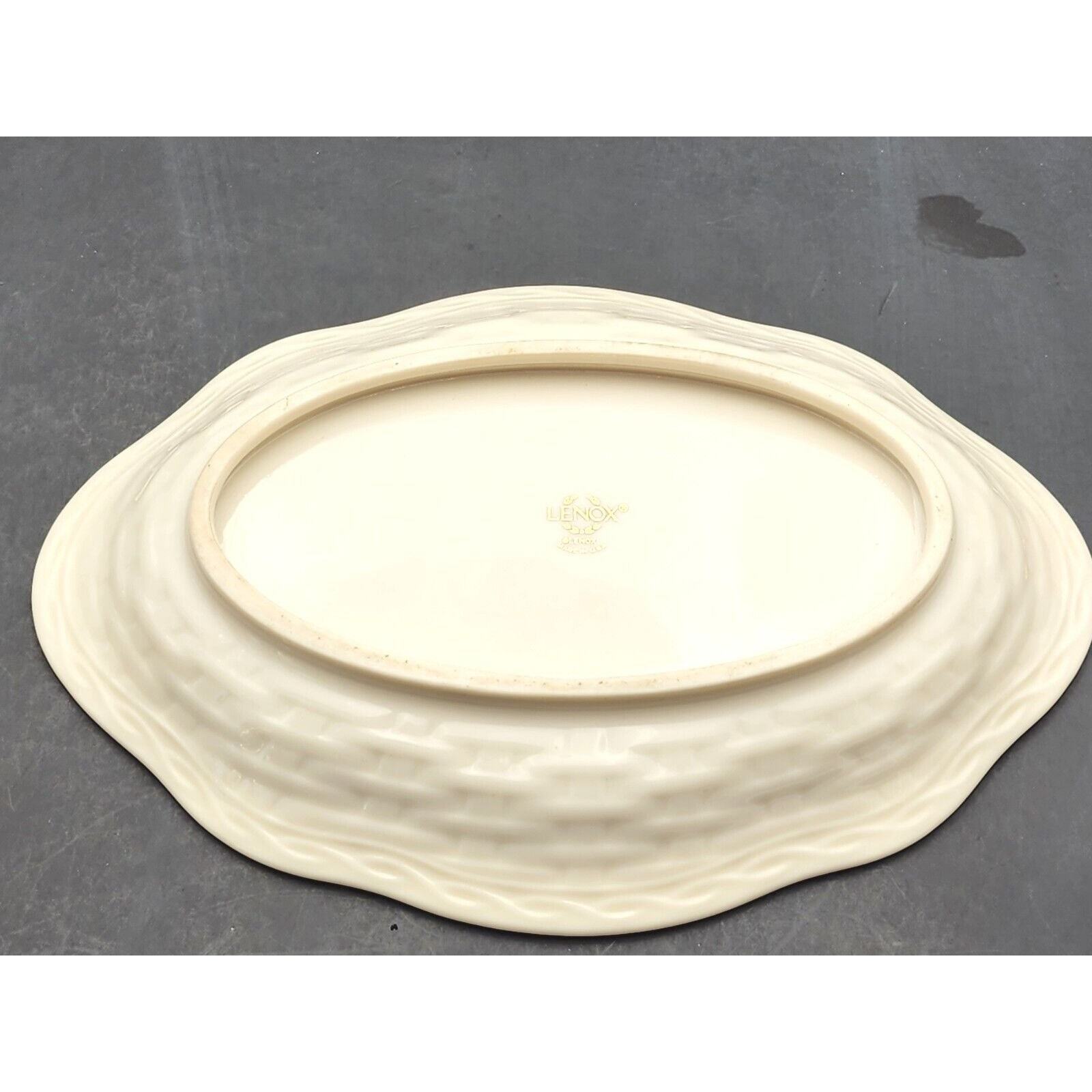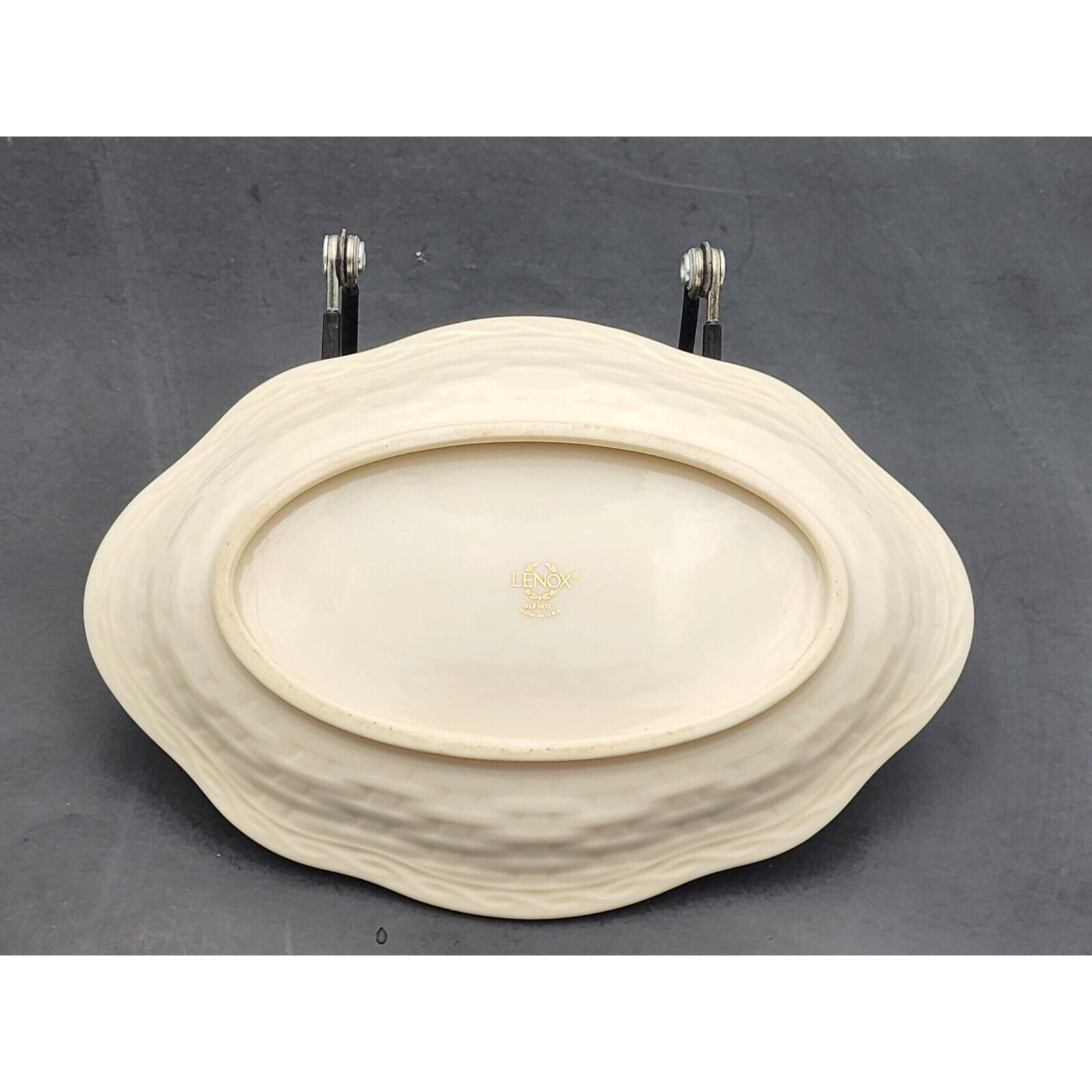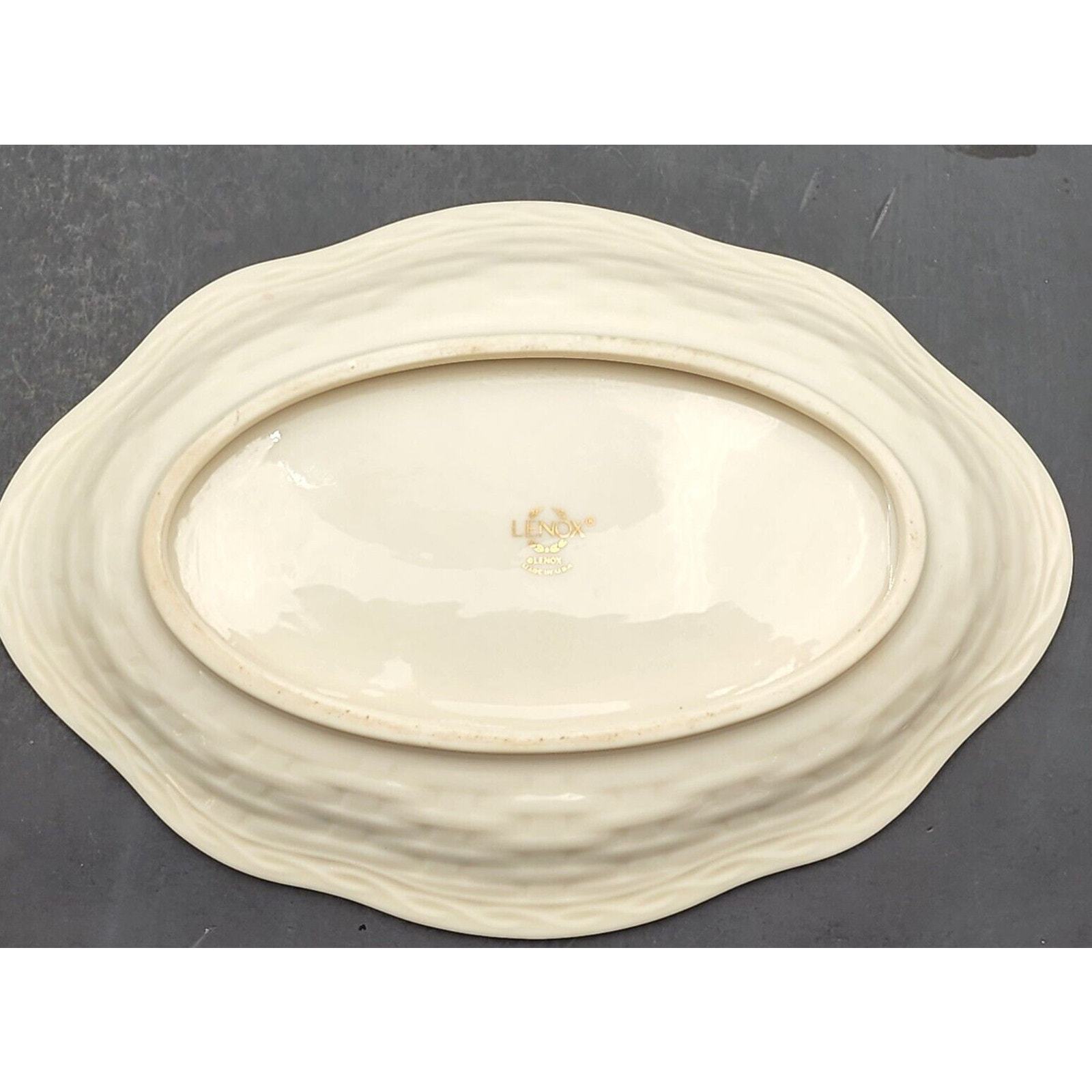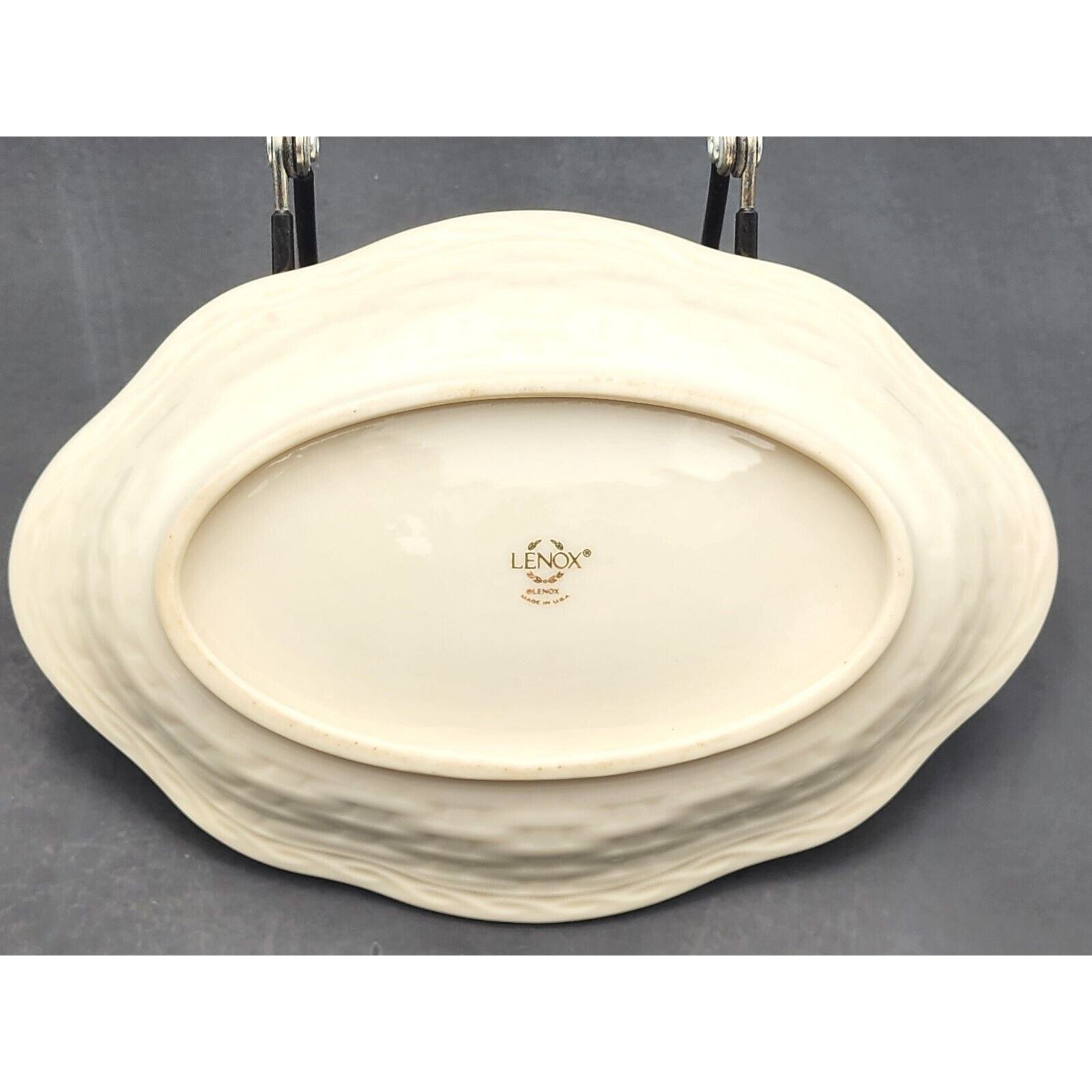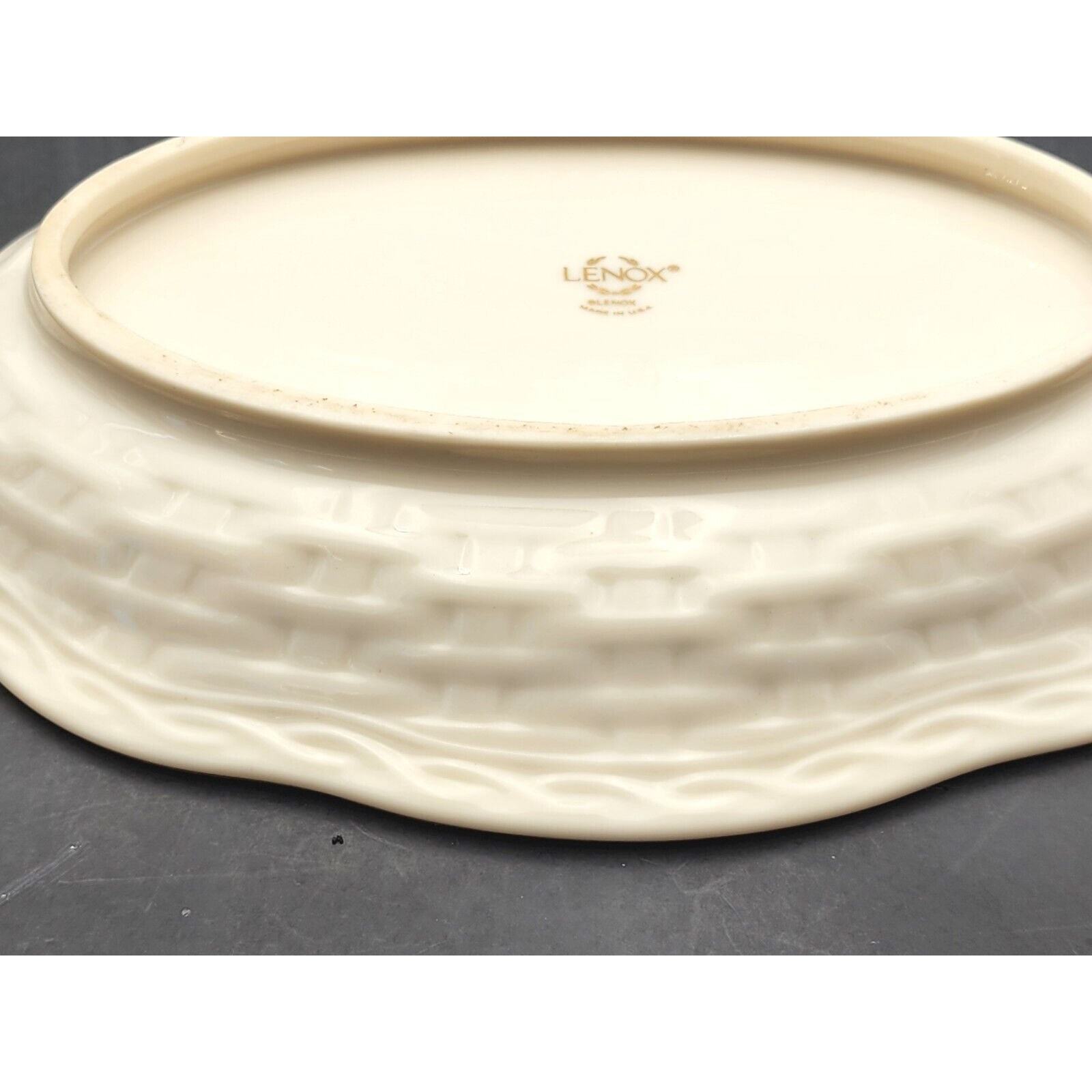 This Lenox candy dish from the 1980s is a rare vintage find that will add a touch of elegance to any space. The oval dish is decorated with purple flowers and a yellow ribbon, making it a beautiful decorative piece for display or for serving candy and other small treats. Crafted from fine China and with a painted backstamp, this dish is a unique addition to any collection.