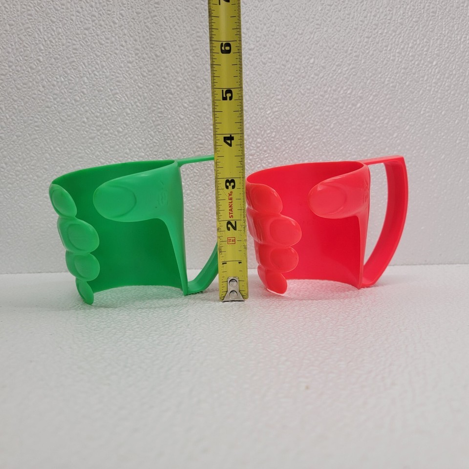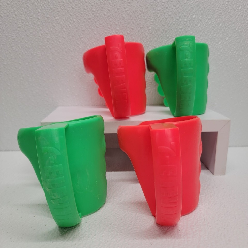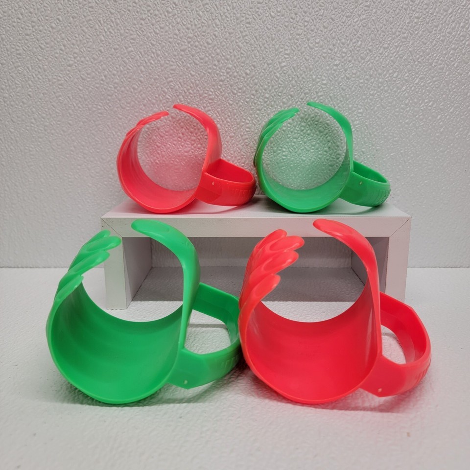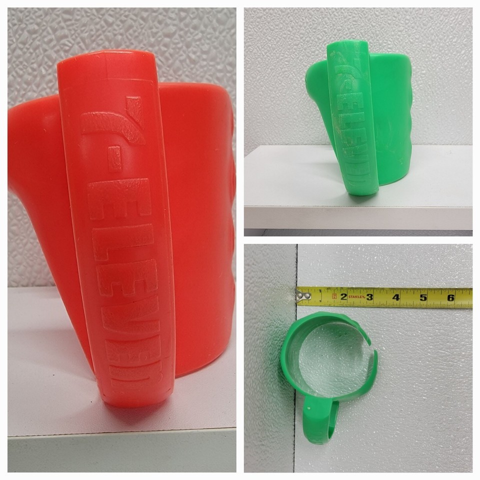 4 Vintage 7-Eleven Red Green Plastic Hand Cup Holder Drink Slurpee Advertisement. Images show actual items that will ship.