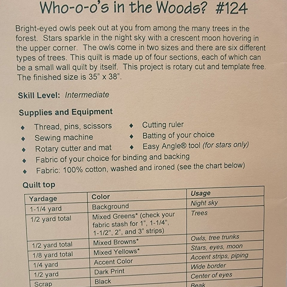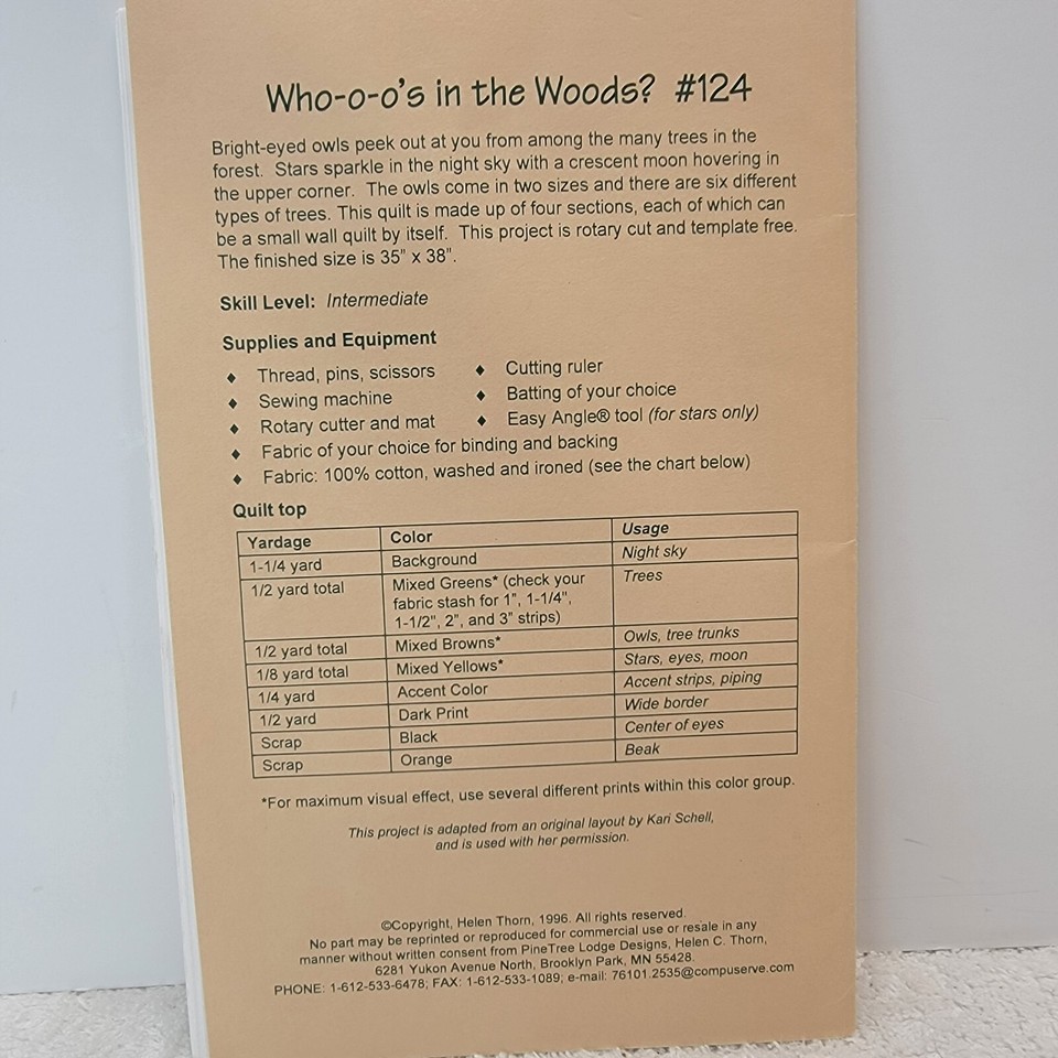 Pine Tree Lodge Designs Who-o-o's In The Woods #124 Owl Hanging Quilt Pattern - SEE IMAGES