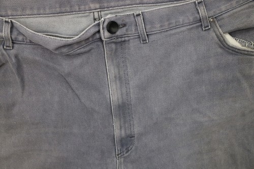 Thrashed. Waistband button replaced. Back belt loop ripped and a hole where i was ripped. Blemishes front and back. Cuffs distressed. Discolored and faded. USA made