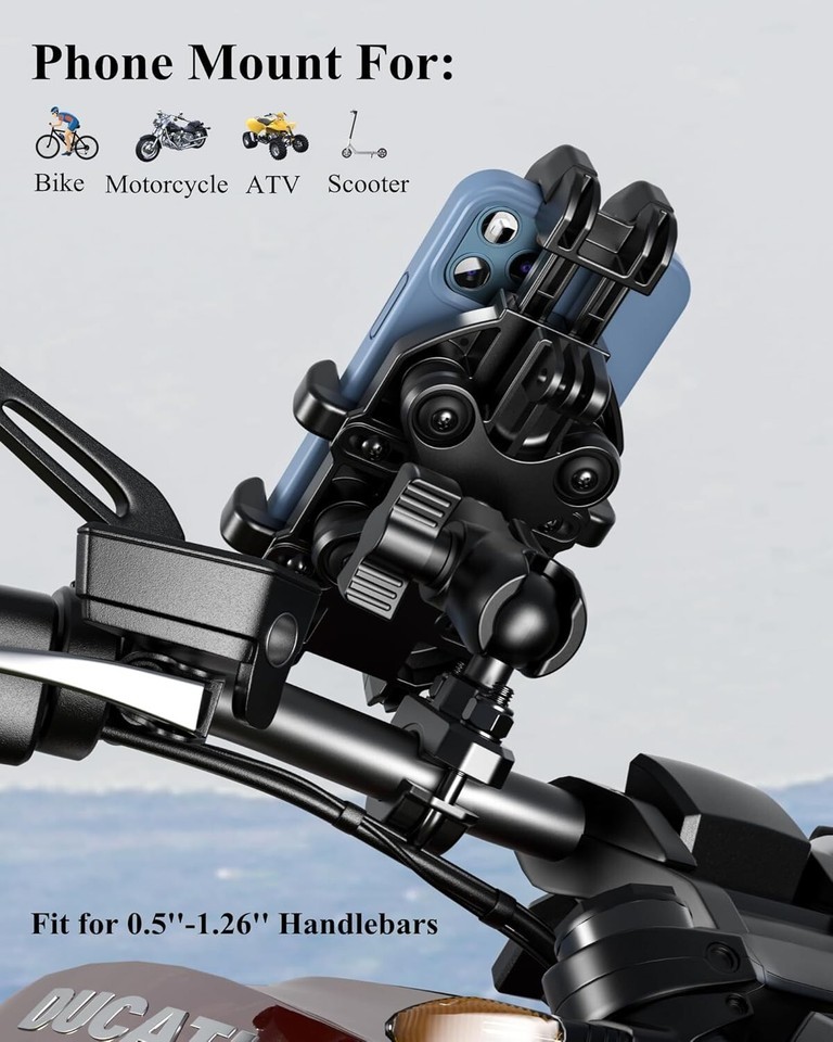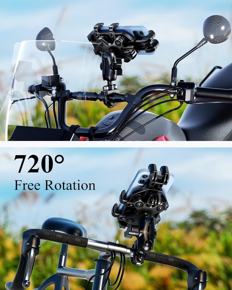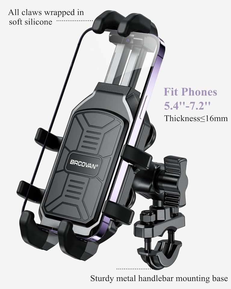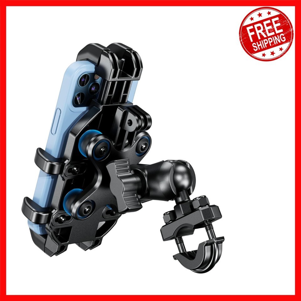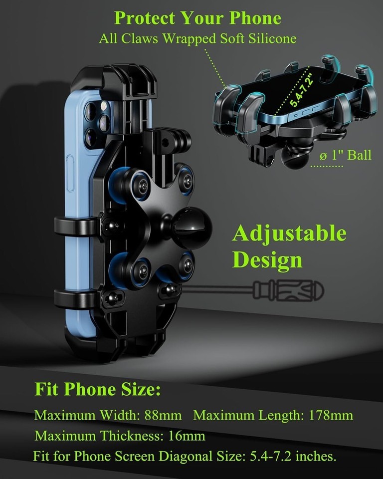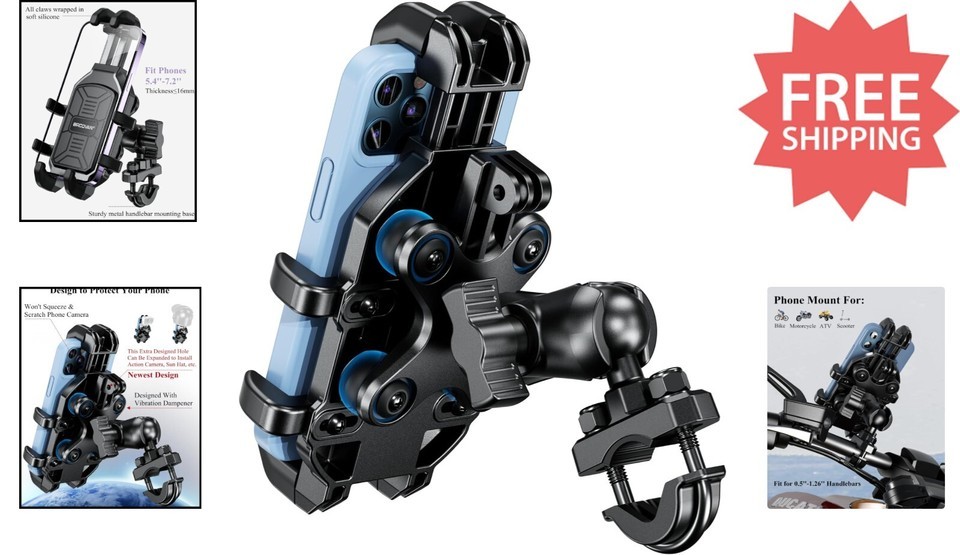 Experience maximum durability and security with our motorcycle phone holder, crafted from high-strength composite materials designed to withstand demanding environments. Its robust U-shaped metal handlebar mounting base fits handlebars from 0.5'' to 1.26'', compatible with motorcycles, bicycles, e-bikes, strollers, and more. The built-in industrial springs and innovative eight-claw design ensure your phone stays firmly in place, even on bumpy roads. Equipped with vibration dampers and soft silicone padding, it protects your phone and camera from shocks and scratches. Enjoy one-handed operation for easy phone access and a 720-degree rotating joint for optimal viewing angles. Adjustable to fit a wide range of phone sizes (up to 88mm in width and 178mm in length) and featuring a case-in design, this versatile mount is ideal for screens from 5.4 to 7.2 inches. To ensure fast and reliable delivery, we work with multiple fulfillment partners and suppliers. Depending on availability and location, your order may ship from different warehouses or arrive in packaging that varies from item to item. Tracking details are typically provided shortly after shipment, and customer satisfaction remains our top priority. Please note that due to carrier policies and regional regulations, certain items may not be eligible for delivery to specific states or territories.