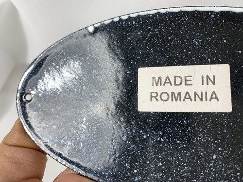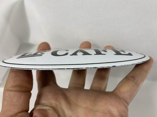 This looks to be in great shape, and not sure if it is new or not. A sturdy, metal, enameled sign, measuring approx 6 1/4 x 3 3/8", it is sure to add a bit of Life and Cafe style to your kitchen. This may or may not be a reproduction as the bac says made in Romania.