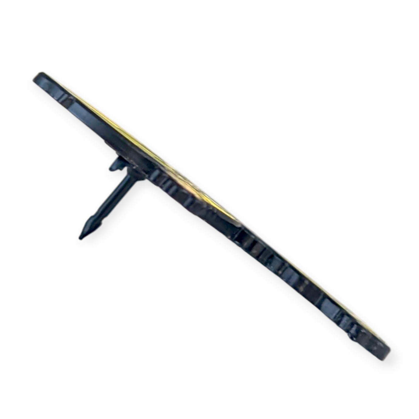 • Sculpted metal with enamel, and finished with a rubber back to keep secure.