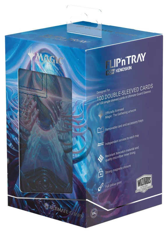 The Flip'n'Tray 100+ Xenoskin is a premium TCG deck box made of full-color printed, resistant Xenoskin material and not only offers space for 133 double-sleeved cards in Ultimate Guard sleeves, but also an integrated and removable dice tray. The Flip'n'Tray 100+ Xenoskin, featuring officially licensed artwork from Magic: The Gathering's "Edge of Eternities" set, is the perfect deckbox for Commander/EDH decks and features reliable and strong magnetic closures for safe storage of cards and accessories.