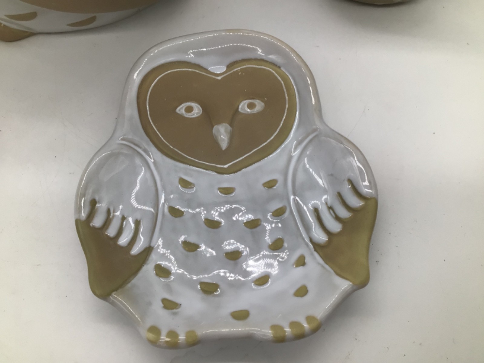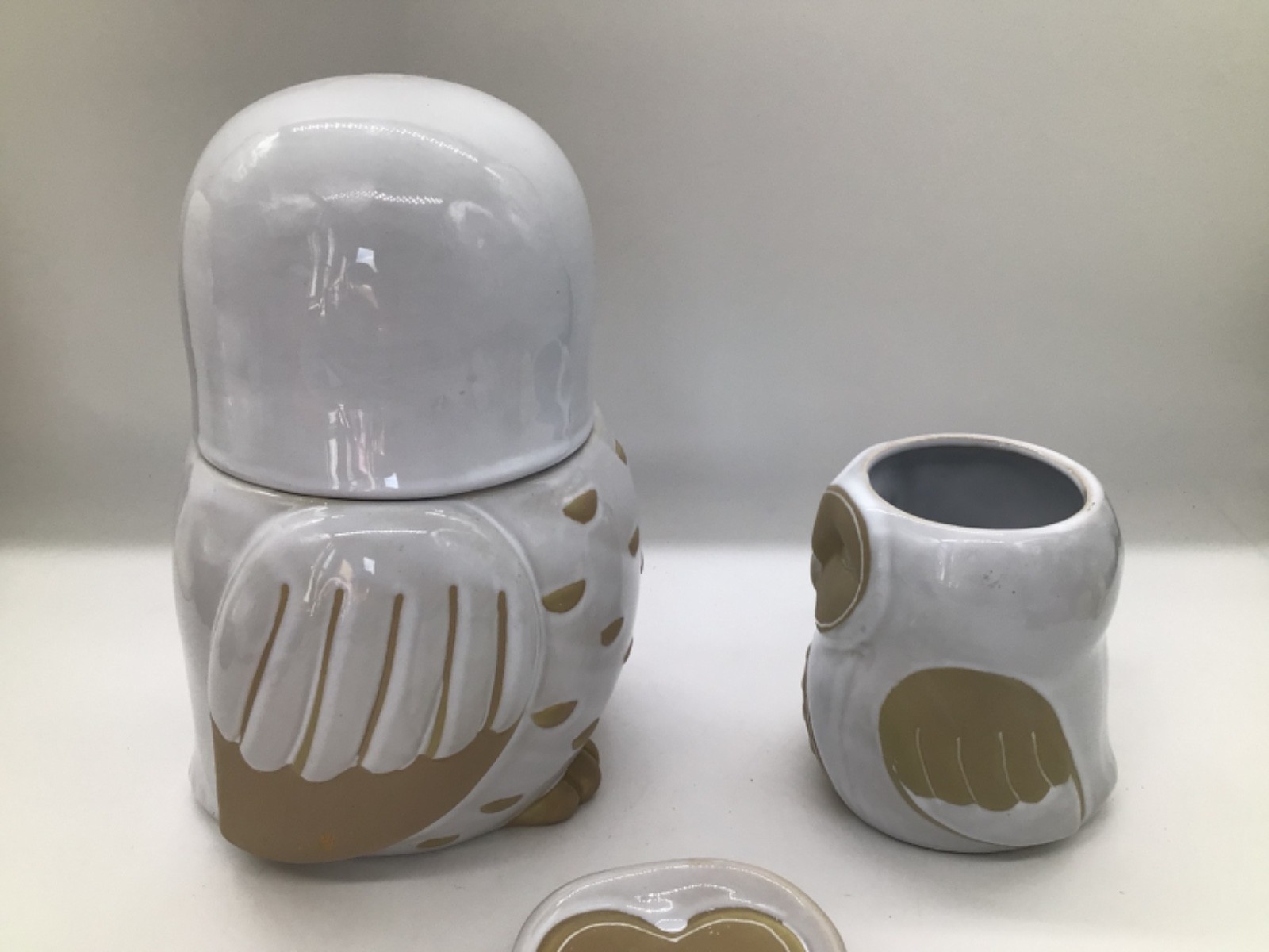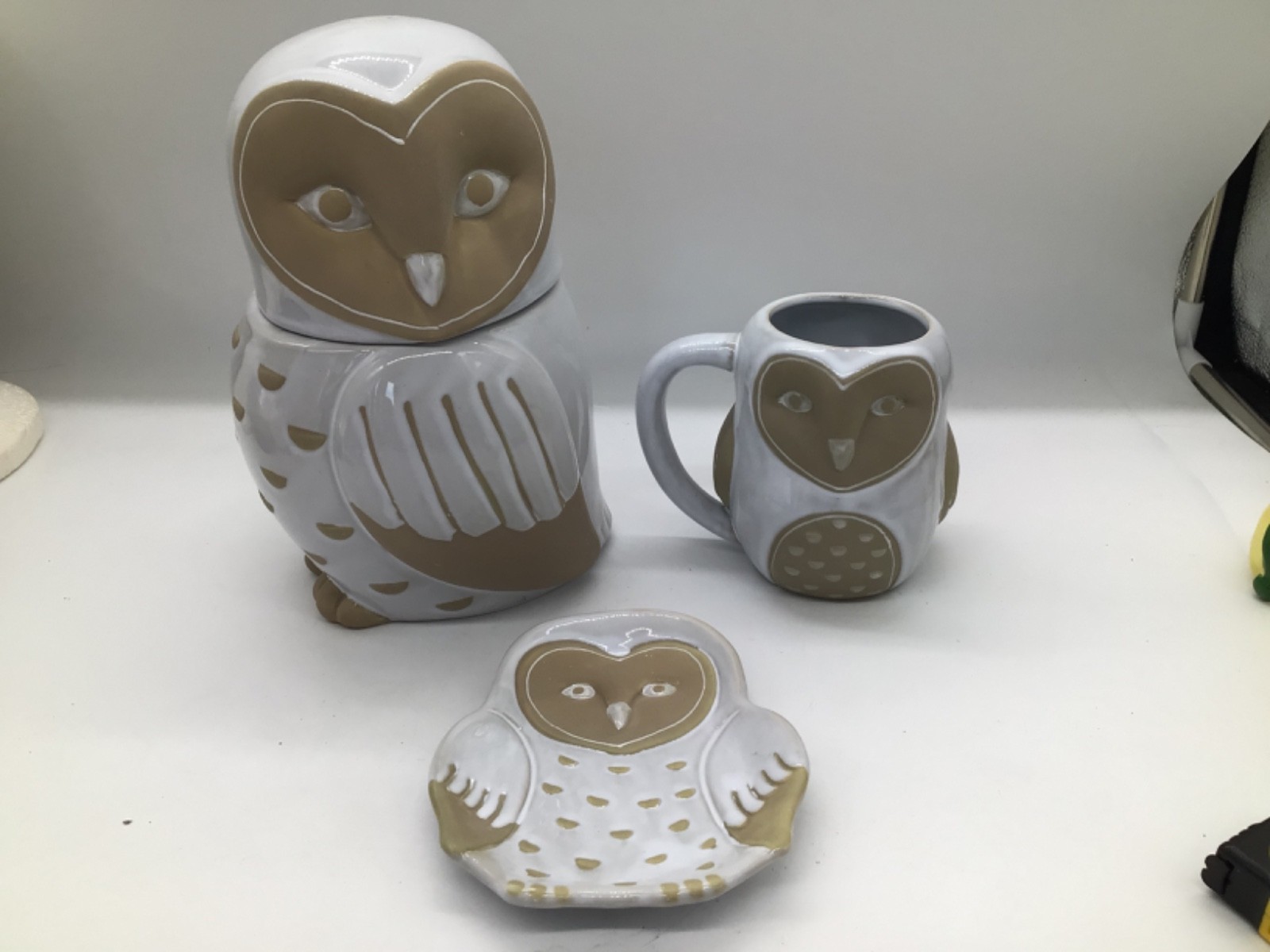 Adorable 3-piece ceramic owl kitchen set including a cookie jar, mug, and small plate. Features a matching white and tan owl design?perfect for owl lovers, kitchen decor, or gift giving.