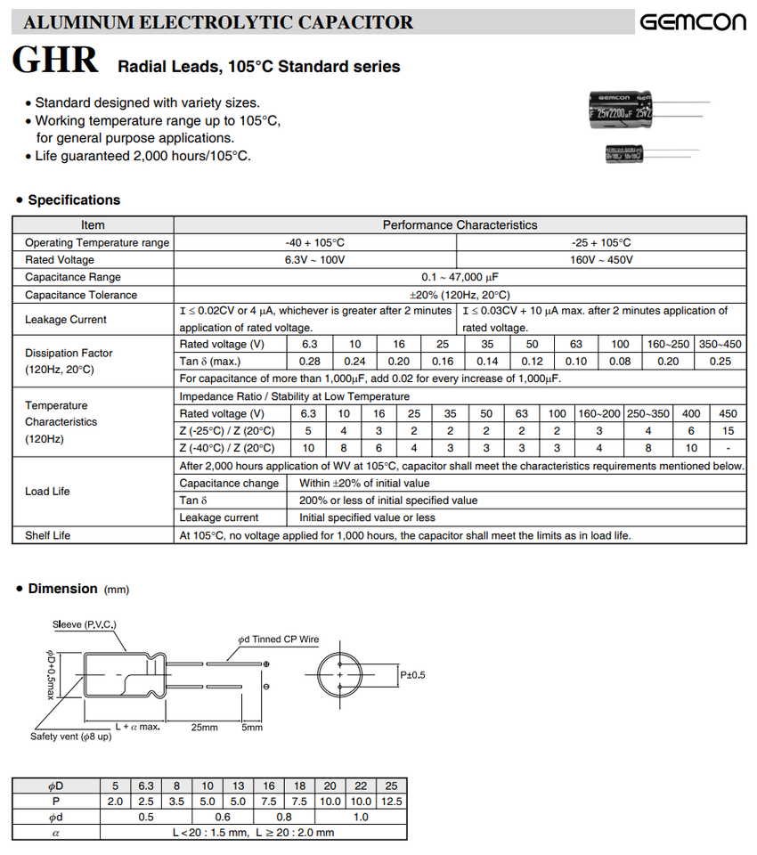 Pack of 50Pcs GHR100M035-0611BV GEMCON 100uF 35V 6.3x11mm Aluminum Electrolytic Radial Capacitor 2000h 105C