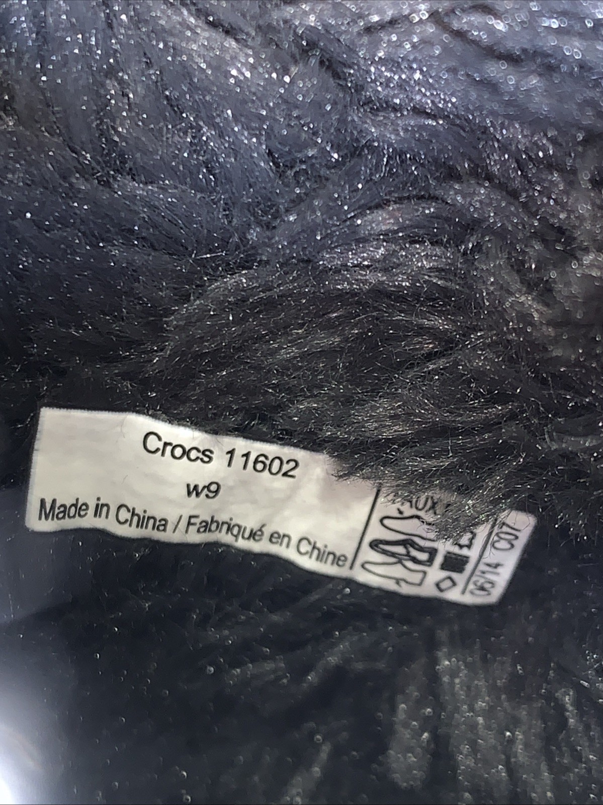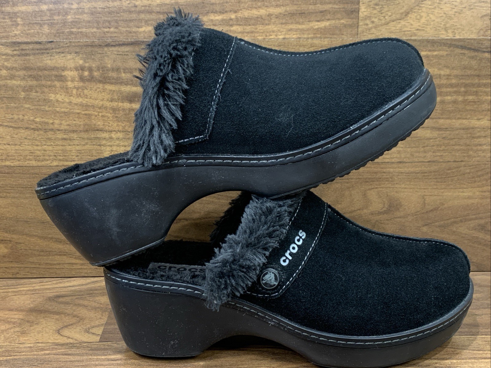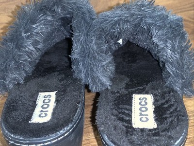 Crocs Womens Clog Platform Heels Black Faux Fur Trim Shoe Slip Ons Size 9