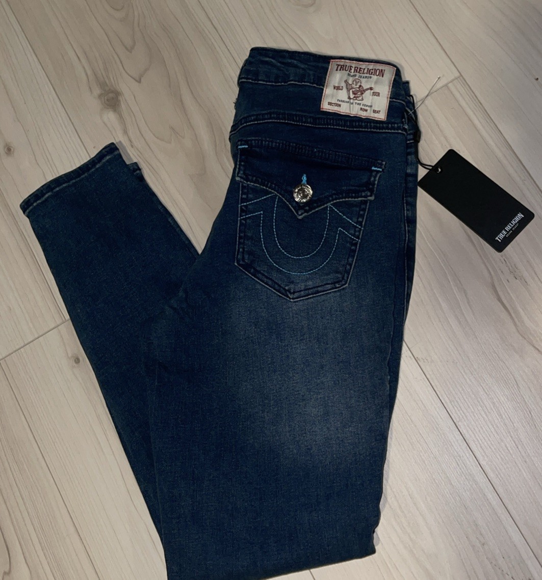 True Religion Jennie Curvy Mid Rise Super Skinny Flap Pocket Abyss Wash Sz 27