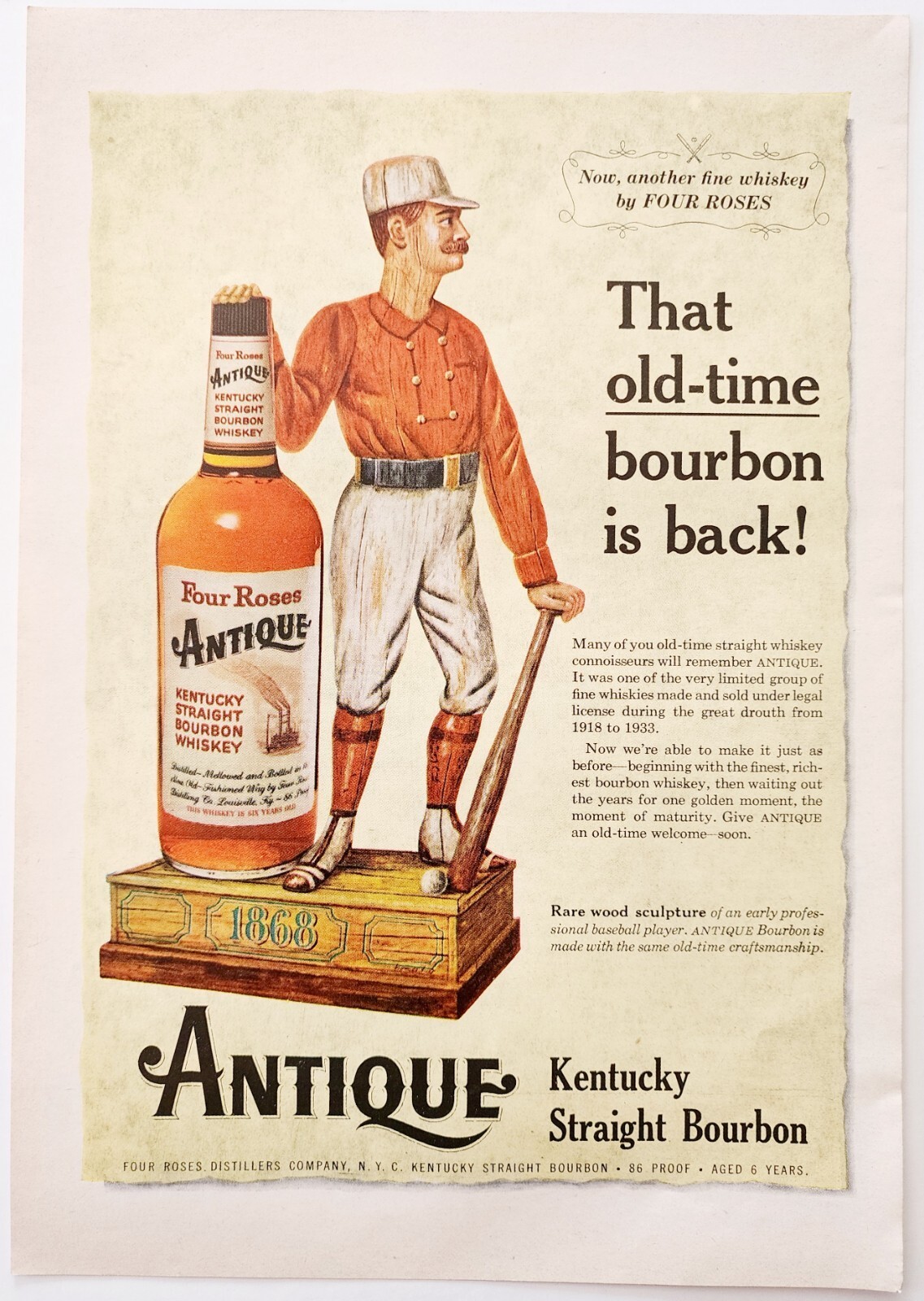1959 Four Roses Antique Whiskey Advertisement Distillery Baseball Statue DWF13