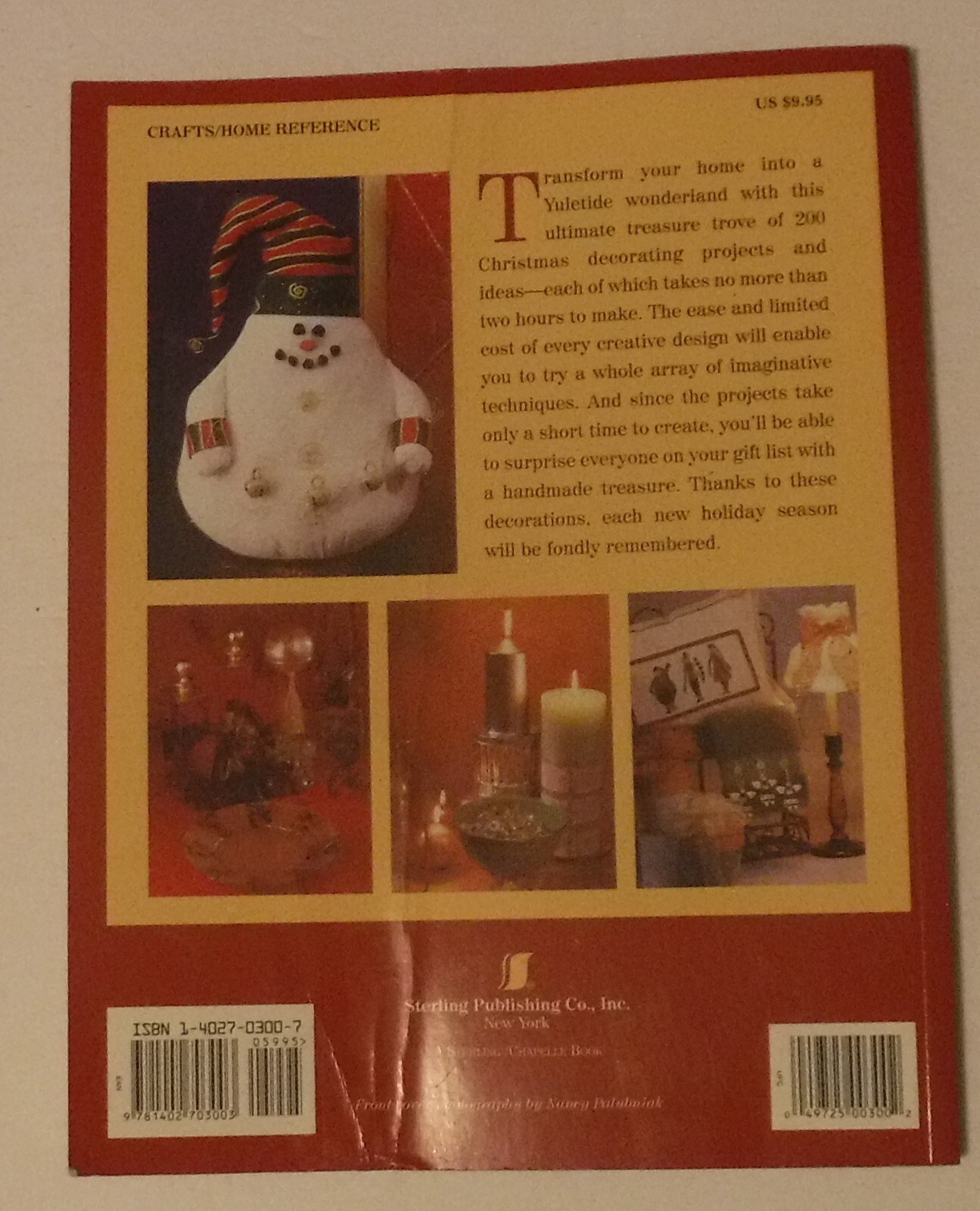 Two hours is all you need to craft any of the more than 200 holiday projects in this collection. Solve all your Christmas decorating and gift-giving needs with a Paper Angel Garland, Moss Star, Snowman Clay Pin, Chenille Christmas Stocking, Burgundy Lampshade, Boxwood and Lemon Leaf Wreath, Grapevine Christmas Tree, Velvet Gift Box, Pinecone Kissing Ball, Christmas Cookie Plate, Tole-Painted Frame, Berry Topiary, Aroma Bags, and Satin Tassel Pillow. Perfect for busy and enthusiastic crafters!
