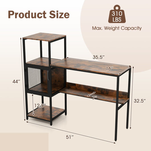 Specifications: Color Rustic Brown Black Material Engineered Wood + Metal Product Size 51" x 16" x 44" Dimensions of Tabletop 35.5" x 16" Tabletop Height 32.5" Height Between Shelves 12.5" Width of Under-desk Shelf 7" Net Weight 45.5 lbs Max. Weight Capacity 310 lbs Box QTY 1(May vary by batch) PackageIncludes 1 x Computer Desk with Bookshelf 1 x Instruction