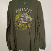 Olive long sleeve tee with a colorful graphic print featuring a camper and the phrase 'Home is Where You Park It.'