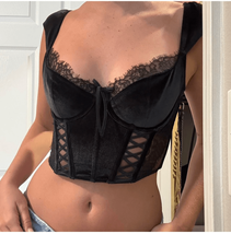 Victoria?s Secret dream angels, black velvet and lace corset style top. Adjustable straps and eight hook closure in the back. Tag size large. Laying flat measures approximately 14 inches shoulder to him as the straps are set and 14 inches armpit to armpit but the underwire cups give a lot of flexibility to the cup size. A fair amount of stretch through the torso. Retailed for $99. Sexy vampire witch Halloween club Las Vegas goth