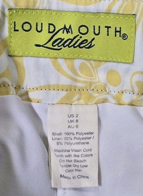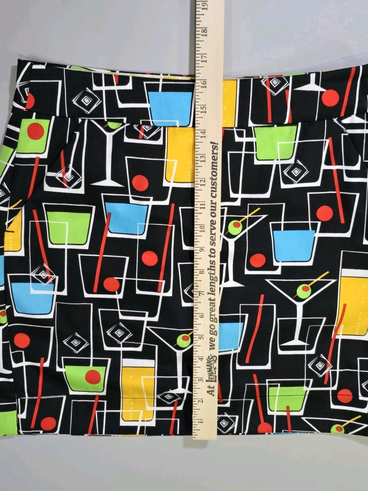 The Loudmouth Golf Martini Olive All Over Print Golf Skort is a rare and colorful women's golf skirt in size 2. Made from a comfortable blend of spandex and cotton, this mini skirt features a side zip closure and hand pockets for convenient storage. Perfect for the summer, fall, or spring seasons, this skort is designed for easy care and is machine washable. With its unique design and retro sports theme, this Loudmouth Golf skirt adds a fun and stylish touch to any golfer's wardrobe.