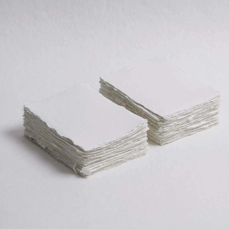 Beautiful handmade cotton rag 200 gsm 4.3" x 8.7" paper in our White shade with a natural deckle edge, suitable for stationery design, digital printing, calligraphy, letterpress, and watercolour. Around a third the size of an A4 sheet, these pieces are versatile horizontally and vertically as menus, compliment slips, or thank you notes. These pieces measure approximately 4.3" x 8.7" (10.9 cm x 21 cm). With natural, delicate, and feathery deckle edges, each of these sheets are made by hand using age-old techniques from 100% cotton, making for soft, strong, and luxe paper. These pieces are internally sized with acid-free sizing without the use of animal gelatins and finished on a cold press. As such, they are nib-friendly and suitable for hand calligraphy, as well as digital printing, including home printing on an inkjet printer.