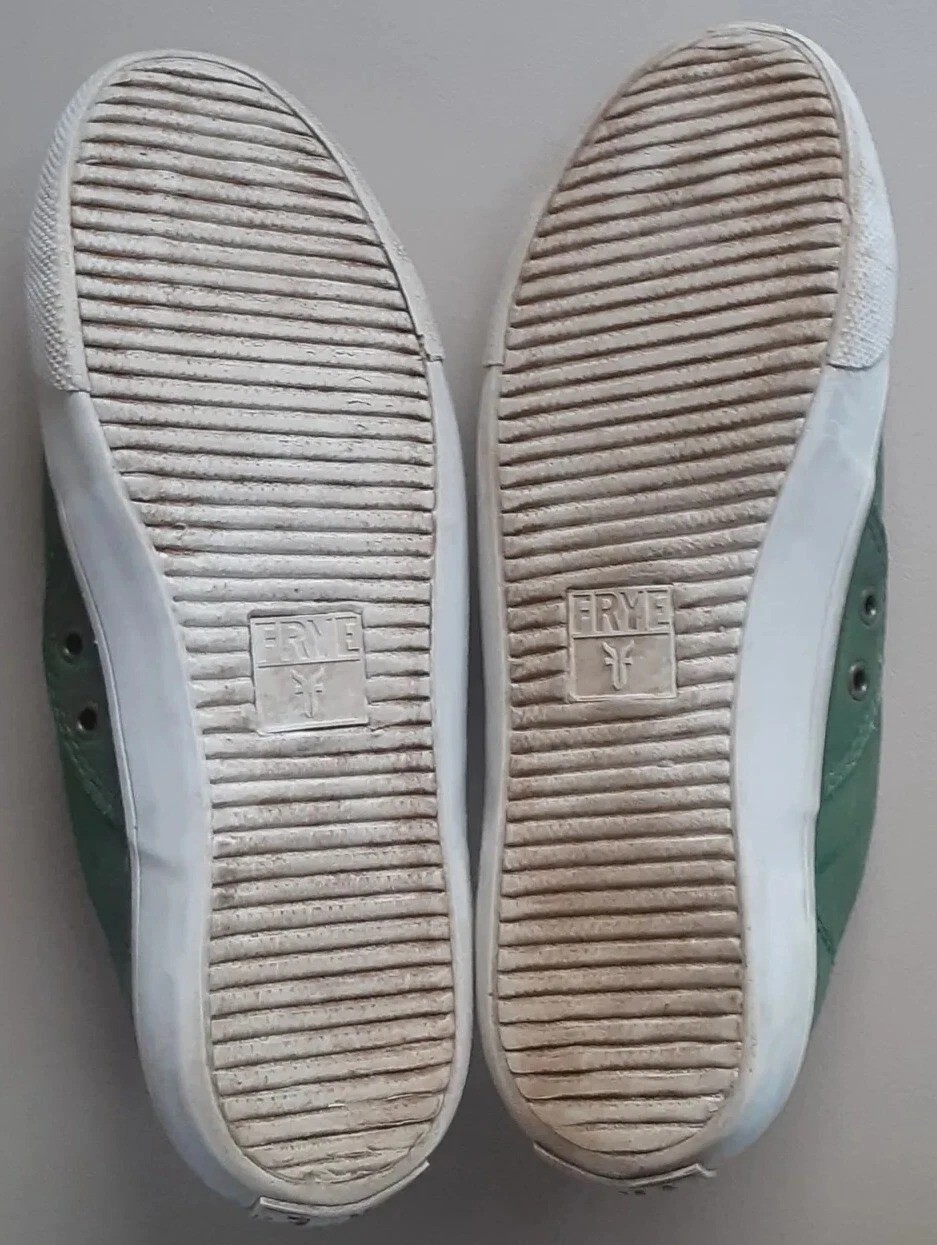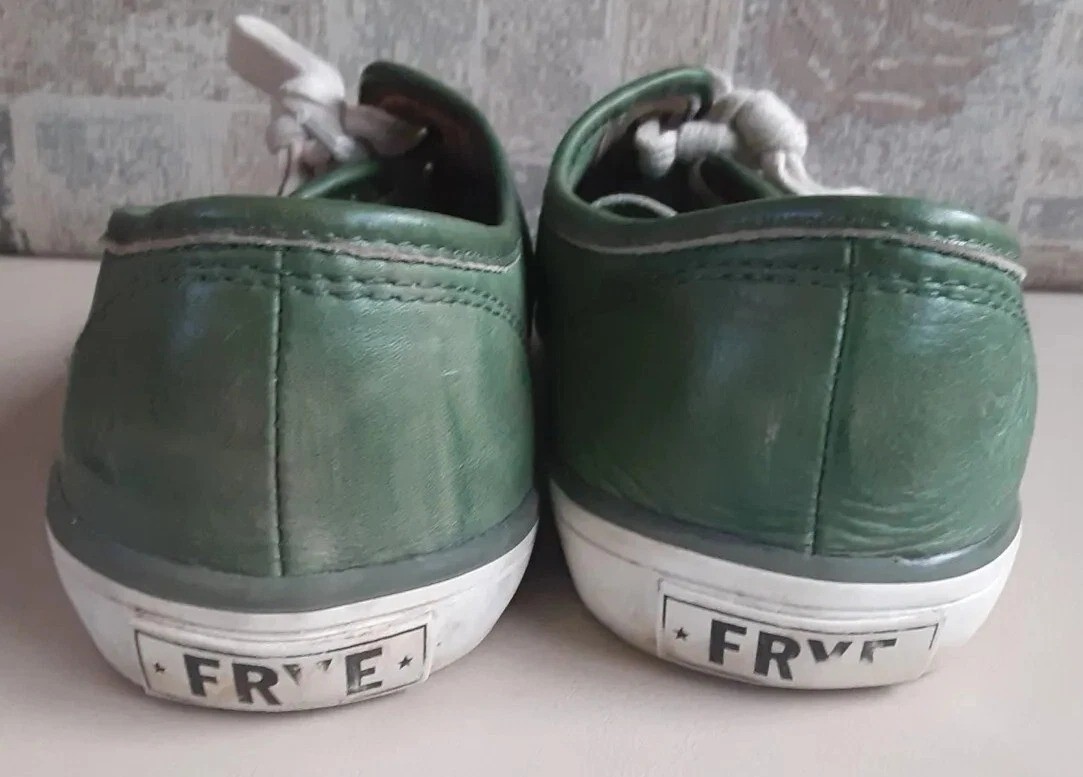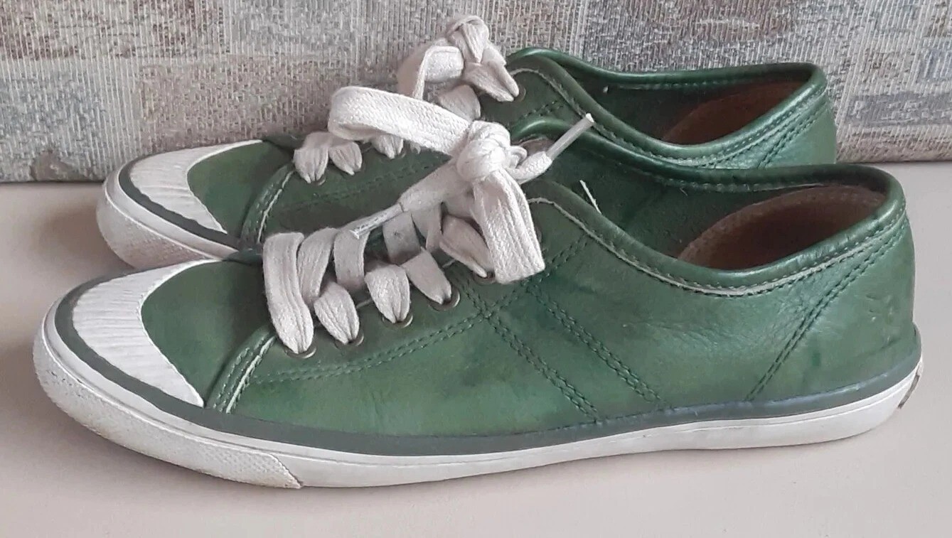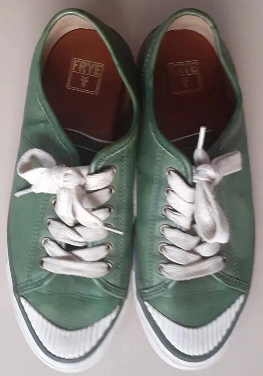 Frye Women's Green Low Top Distressed Leather Sneakers Size 8. Some wear to the Logo on the heels and bottoms of the soles, see pictures for exact condition. Insole length approx. 9 5/8 inches.