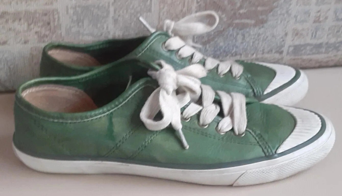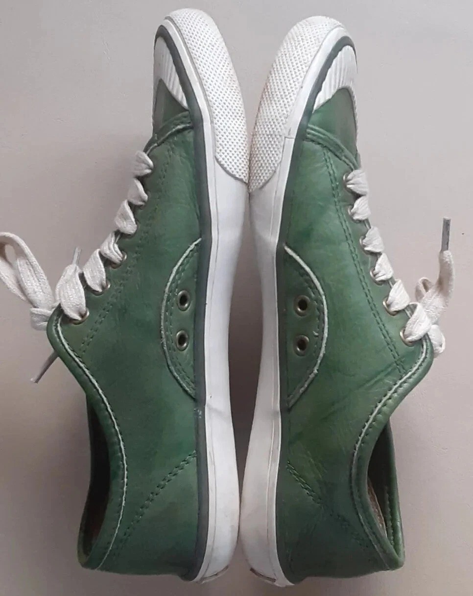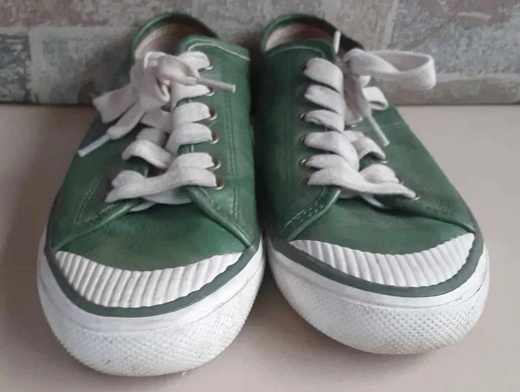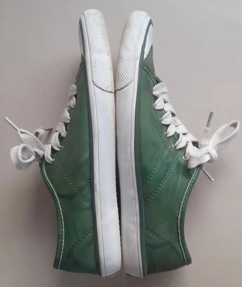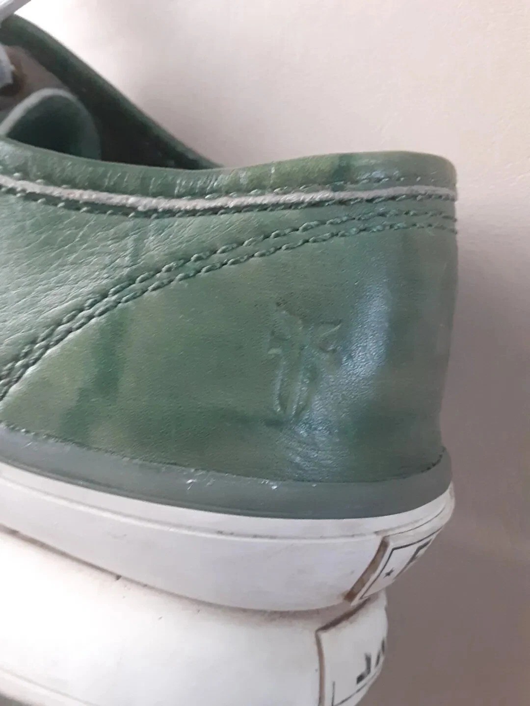 Frye Women's Green Low Top Distressed Leather Sneakers Size 8. Some wear to the Logo on the heels and bottoms of the soles, see pictures for exact condition. Insole length approx. 9 5/8 inches.
