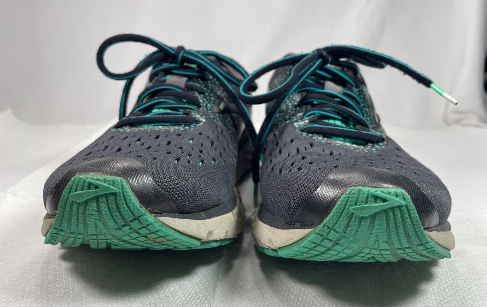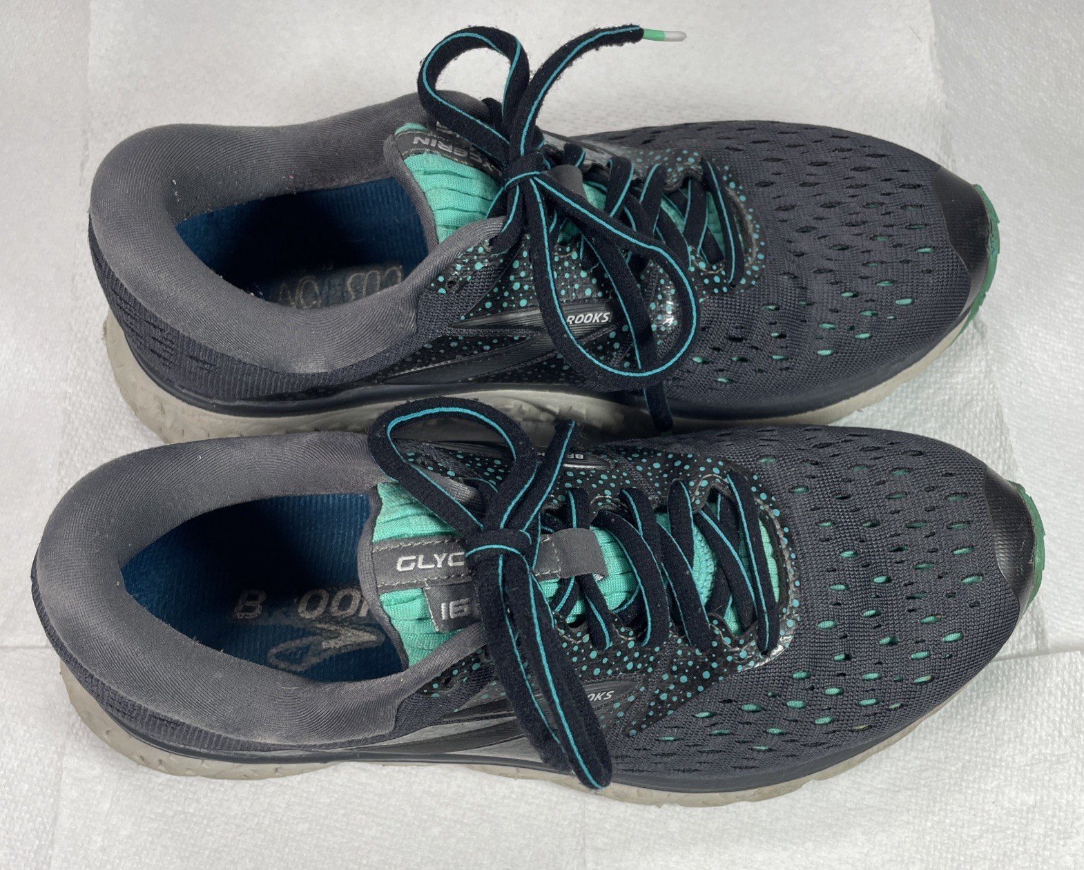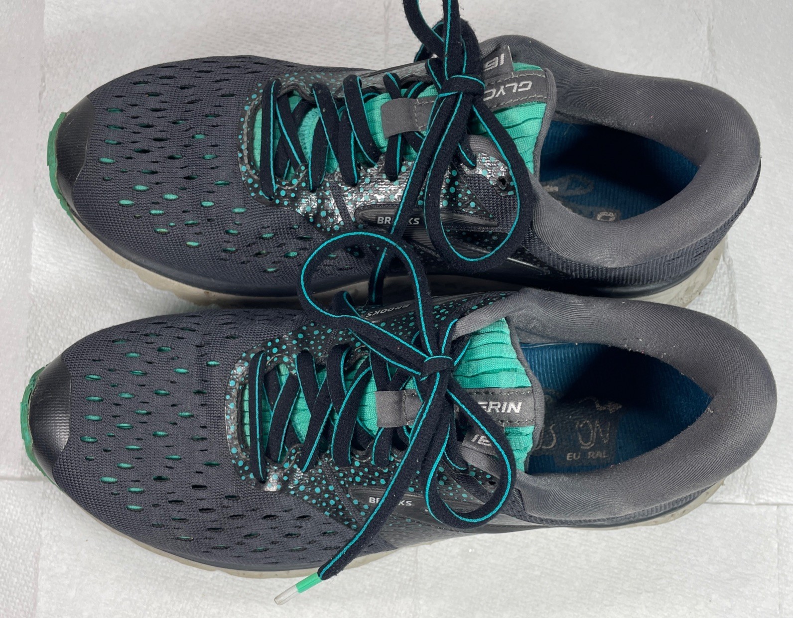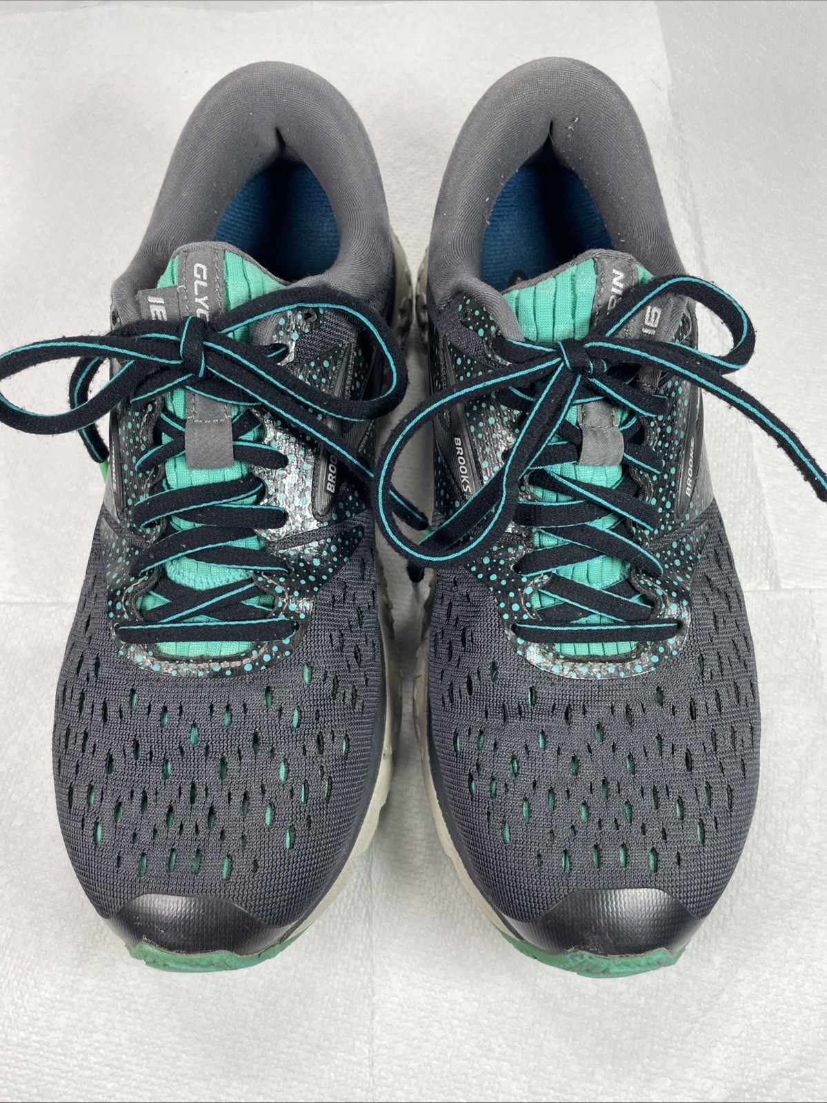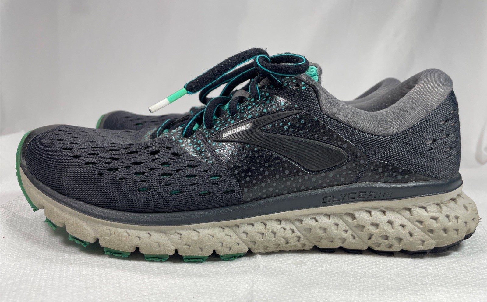 The product is a pair of Brooks Glycerin 16 Women's Running Walking Athletic Shoes Sneakers in dark gray and teal color. These sneakers are a low-top style with a lace-up closure, featuring a breathable mesh upper and rubber outsole. They are designed for running and jogging, with a B shoe width and logo accents. The model number is 1202781B081, and the product line is Brooks Glycerin. The shoes are from the year 2015 and cater to a theme of athleisure.