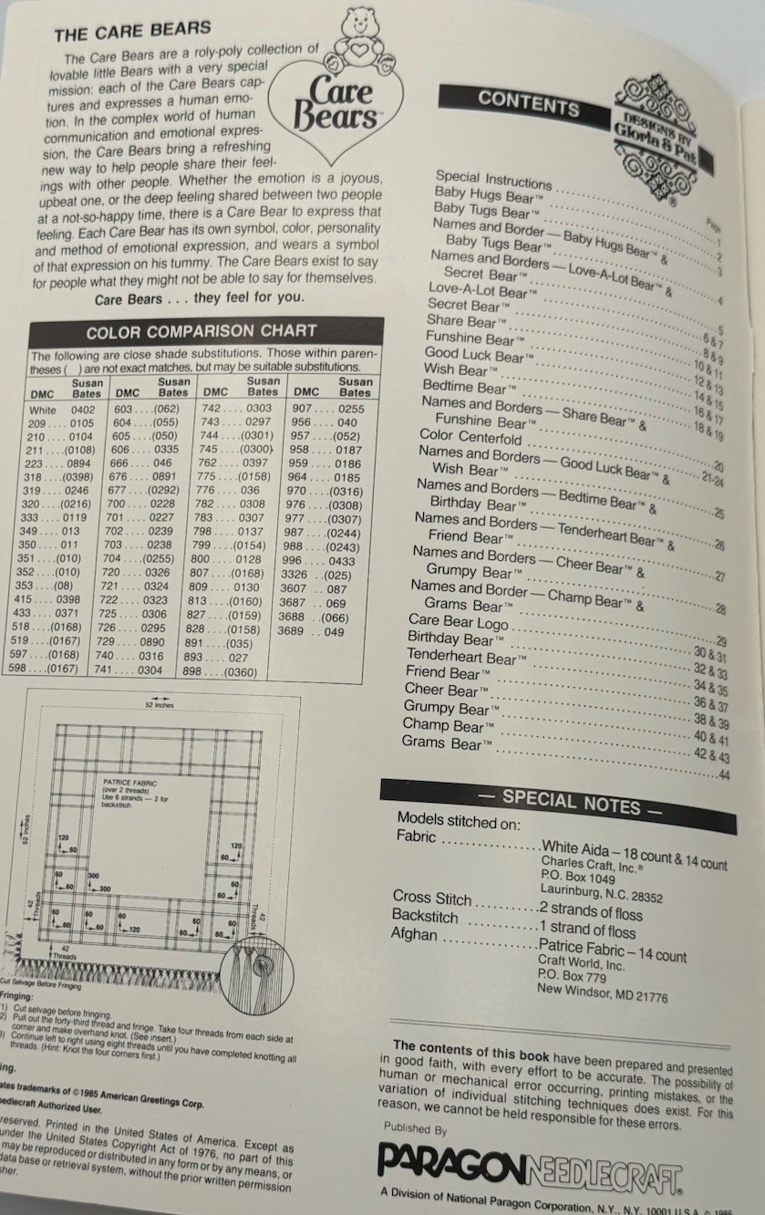Vtg Care Bears Counted Cross Stitch Pattern Book 5100 Gloria & Pat 1985 Paragon