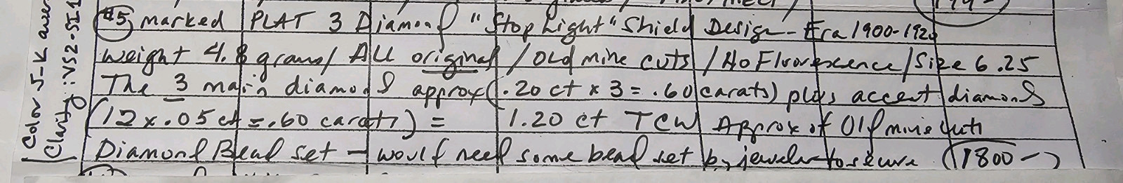 Marked PLAT 3 Diamond "Stop Light" Shield Design - Era 1900s - 1920 (Edwardian beginning Art Deco). Weight 4.8 grams / All Original / Old Mine Cut Diamonds / No Fluorescence / Size 6.25 / Diamonds are Bezel Set - would need some of the bezels looked at by a jeweler to make secure. It has not been worn since the appraisal.
