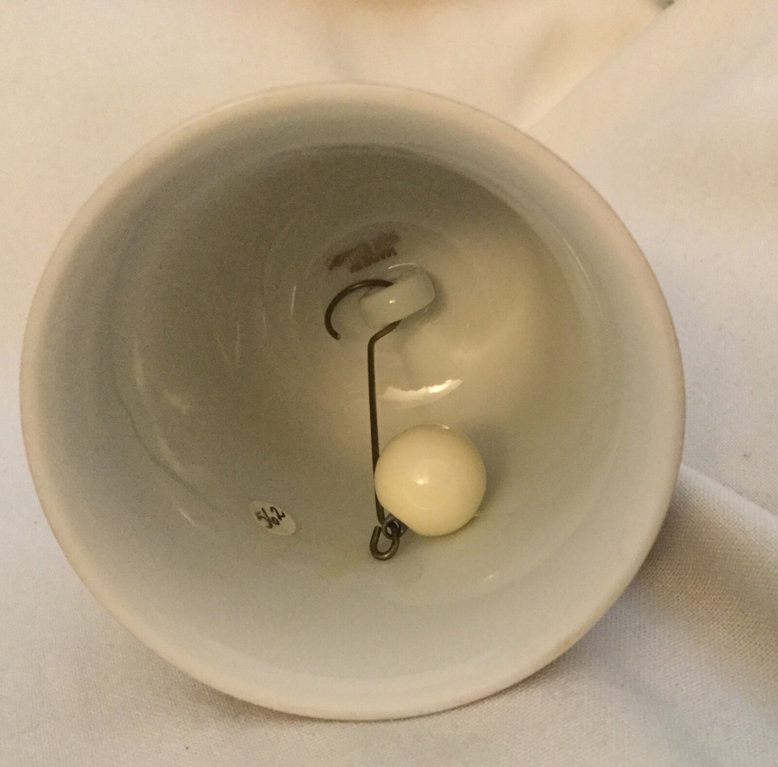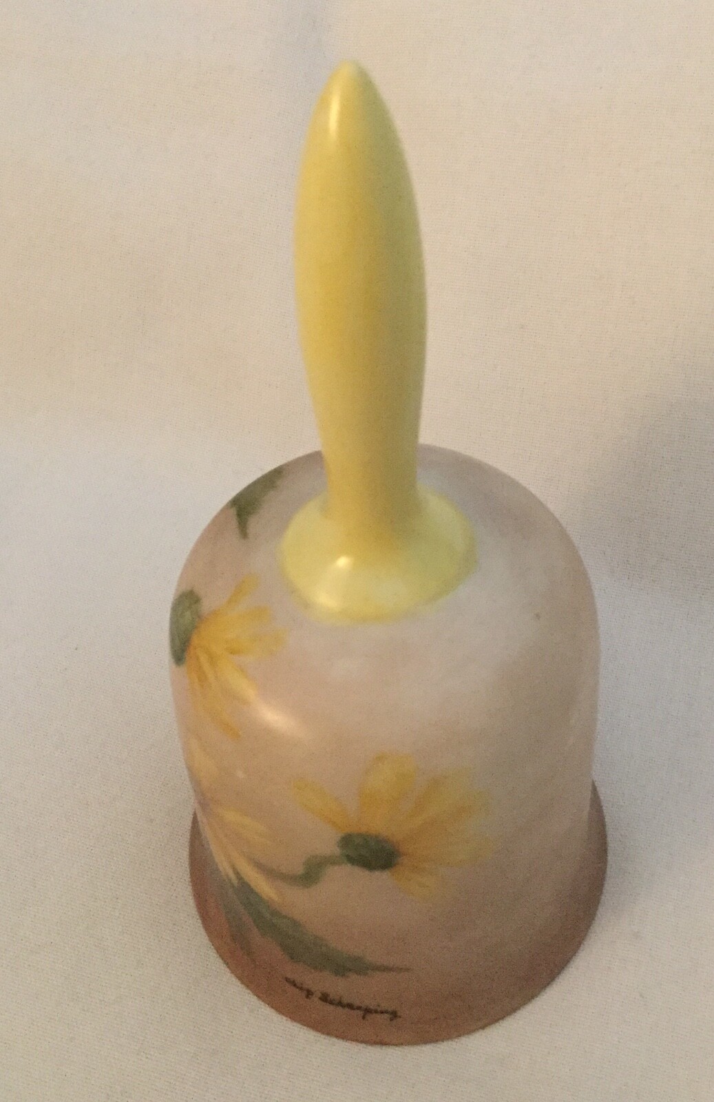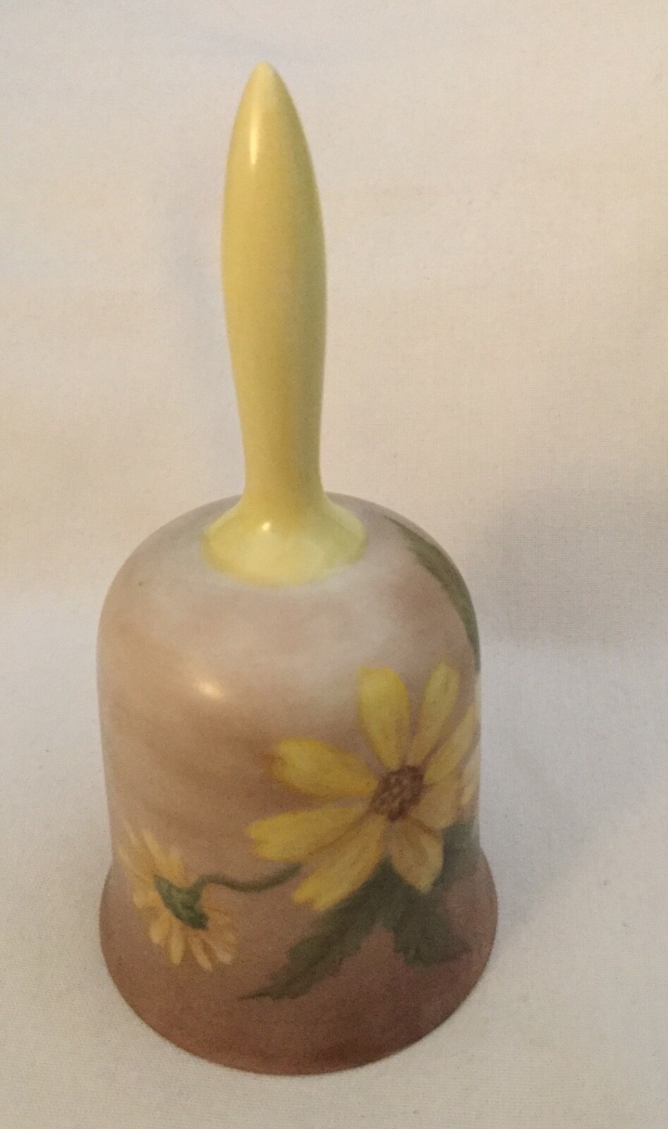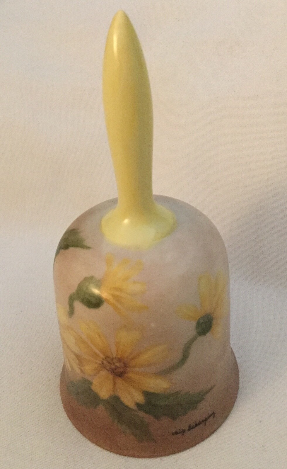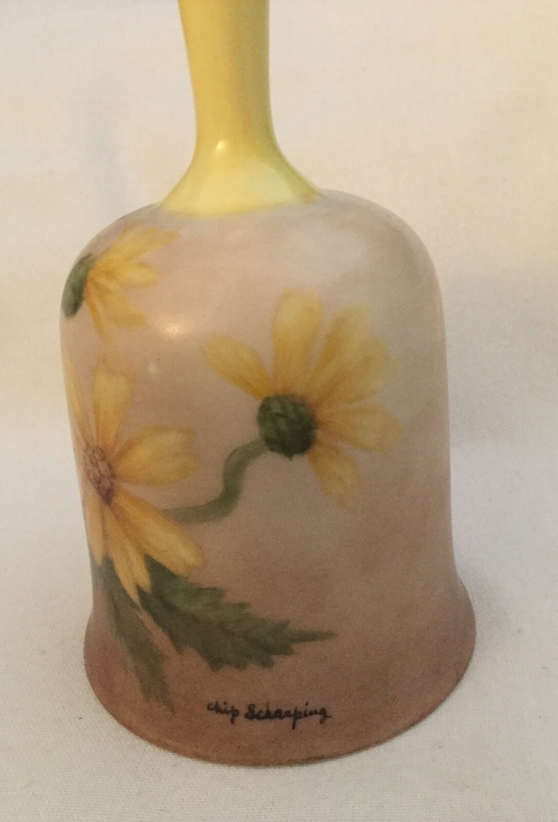 SIGNED WEST GERMANY HAND PAINTED 6? PORCELAIN BELL BY ARTIST CHIP SCHARPING . DESIGN HAS YELLOW DAISY LIKE FLOWERS GREEN LEAVES...HANDLE IS A-BEAUTIFUL BANANA YELLOW... HAS FABULOUS PING / RING ... DATES TO MID CENTURY 1950s ?INSIDE SAYS MADE IN WEST GERMANY?.PART OF LARGE COLLECTION OF BELLS FROM LOCAL ESTATE?.EXCELLENT CONDITION...LAST 4 PHOTOS ARE TO SHOW OTHER ITEMS LISTED?AUCTION IS FOR ONLY 1 PORCELAIN BELL?S / H/ Postage 1 POUND.