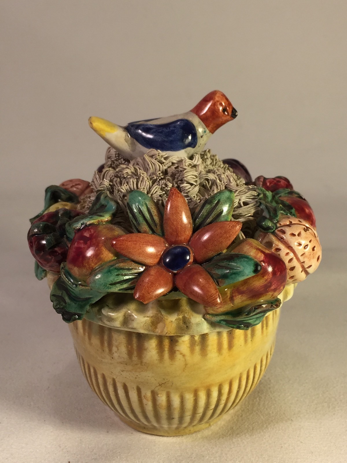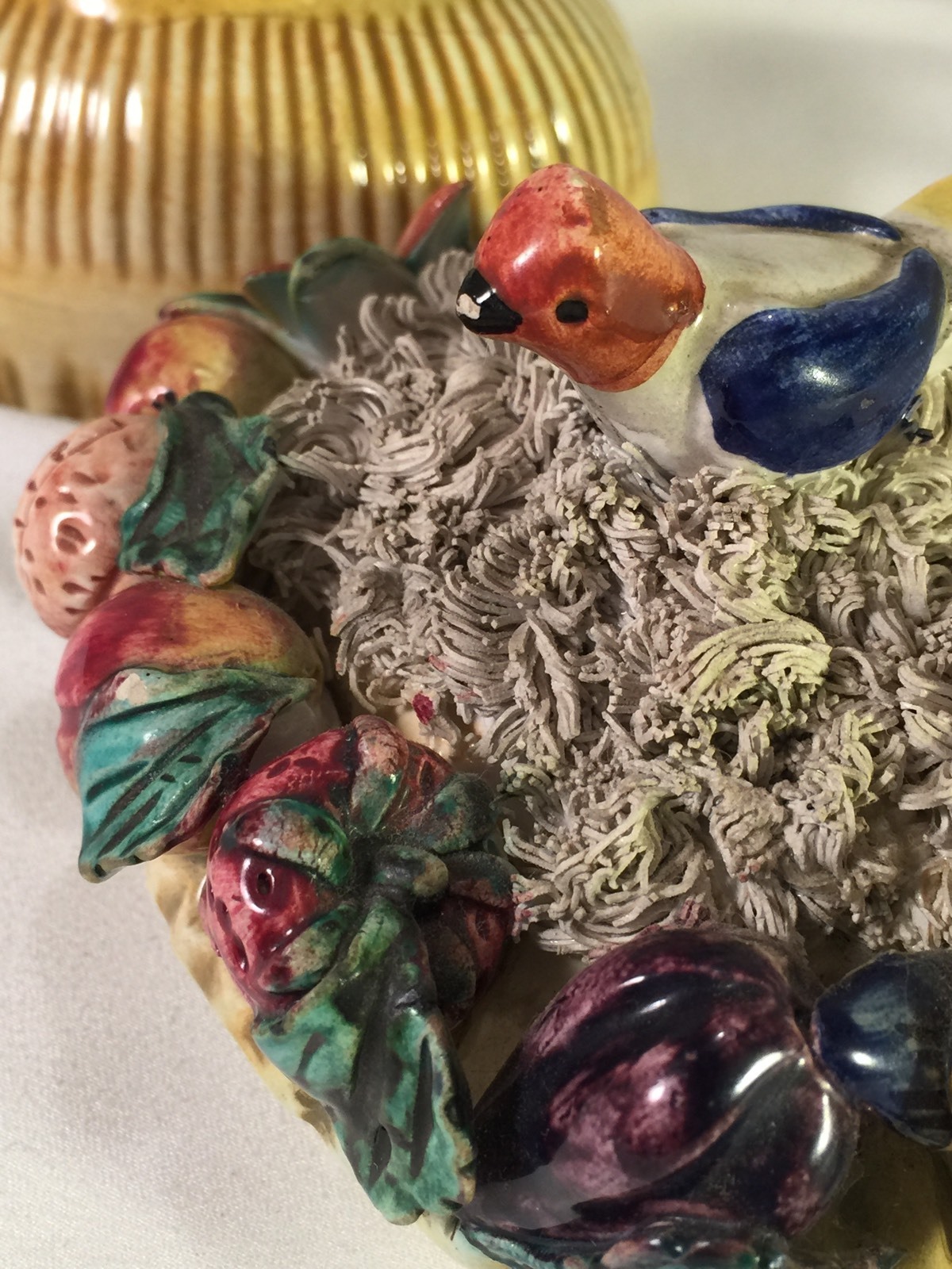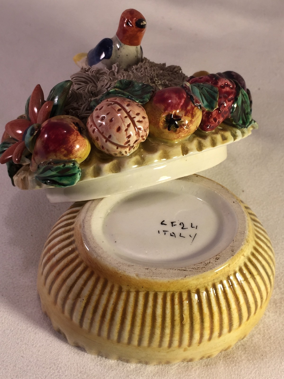 This is a really cool, mixed style, unique bird nest. It is really quite different than anything I have seen before. This bird is perfectly situated atop a fluffy nest surrounded by floral/fruity garland, sure to keep him safe, and equally protecting what lies below. While I am unsure of the maker or exact age, I believe this to be a very old Capodimonte fruit/floral lined, spaghetti bird nest, covered dish/arrangement. Capodimonte Porcelain is widely considered to be among the finest Italian porcelain products in the world. It is signed on the bottom KF24 ITALY. It measures 5" across, 4-1/2" tall.