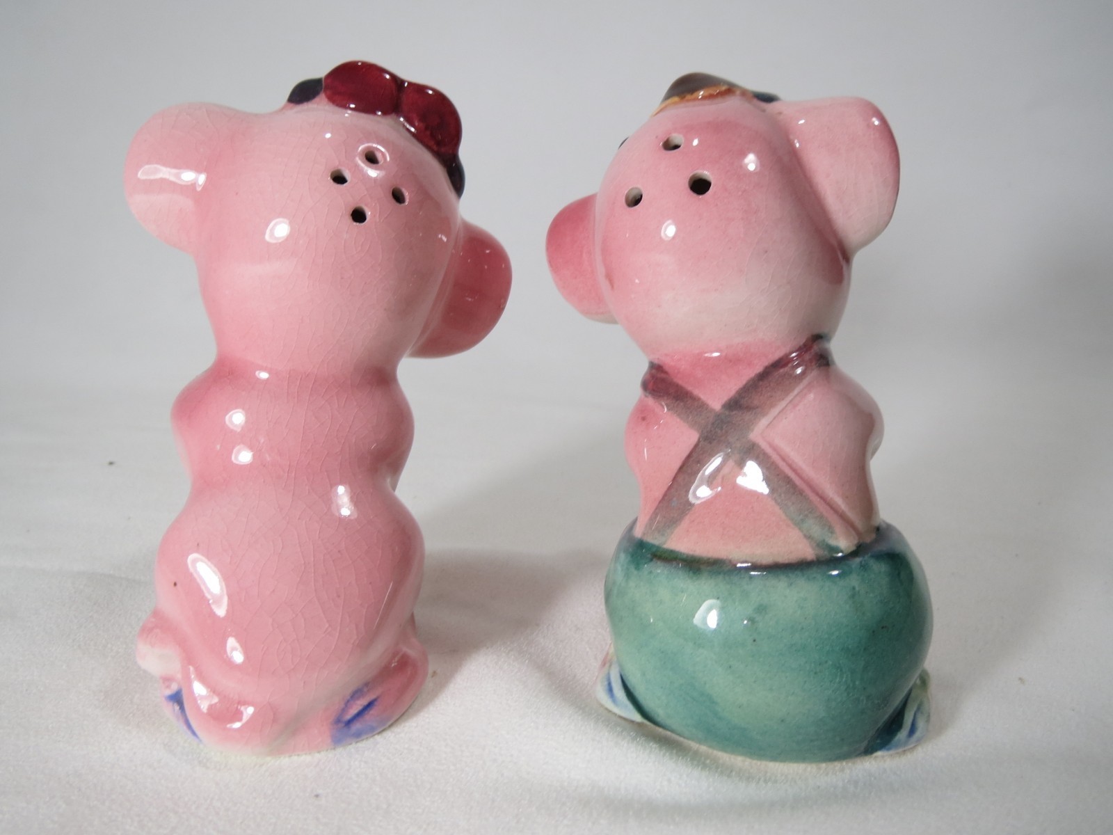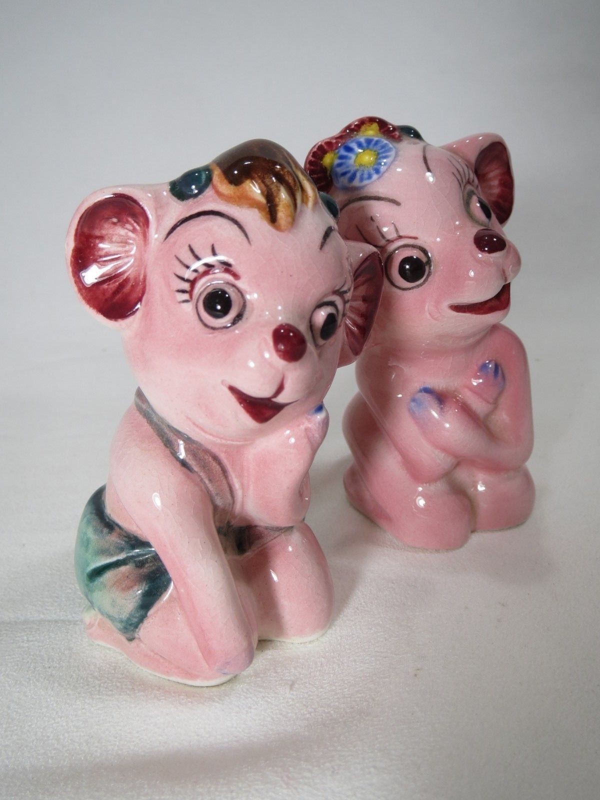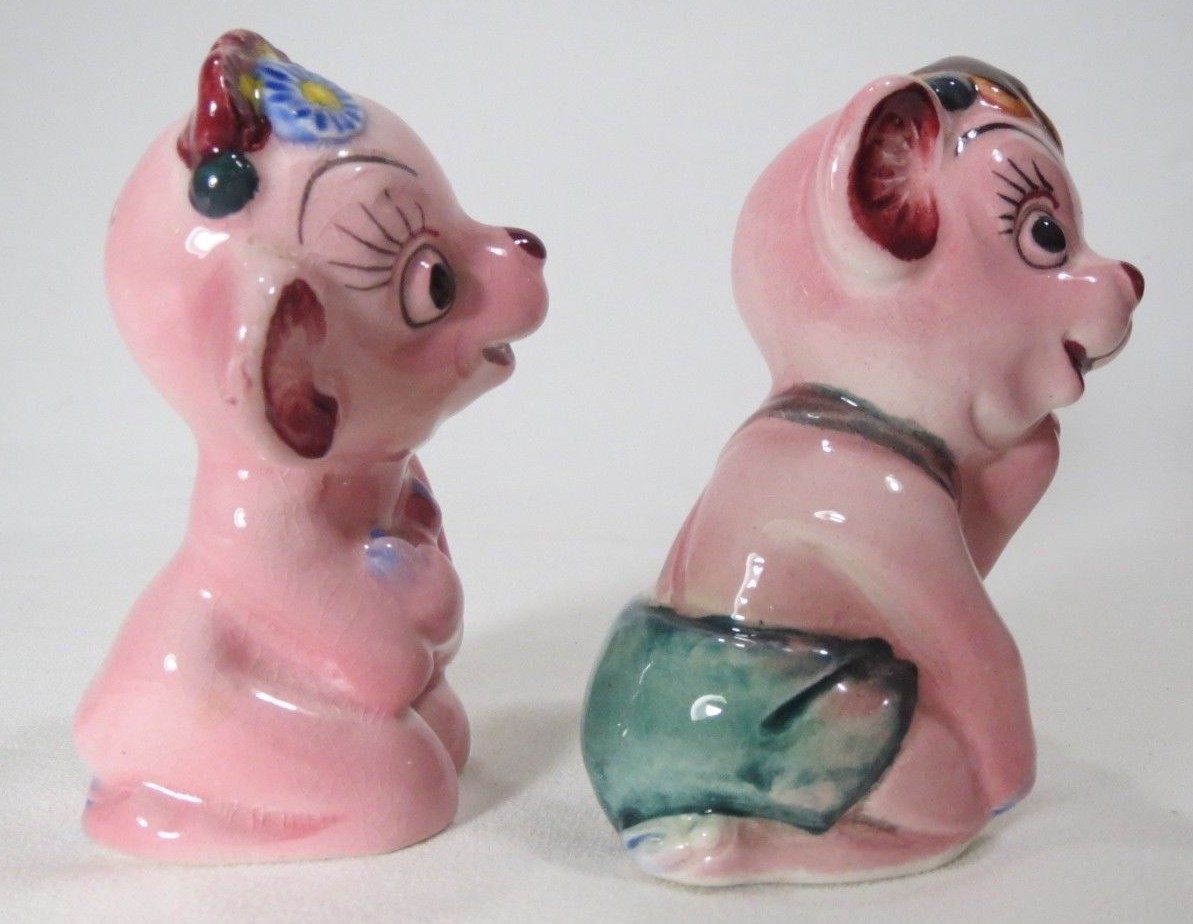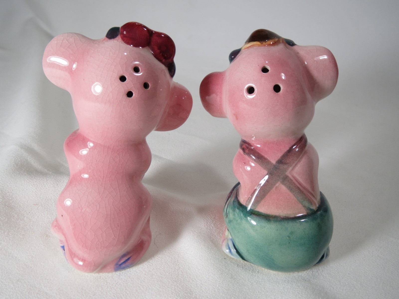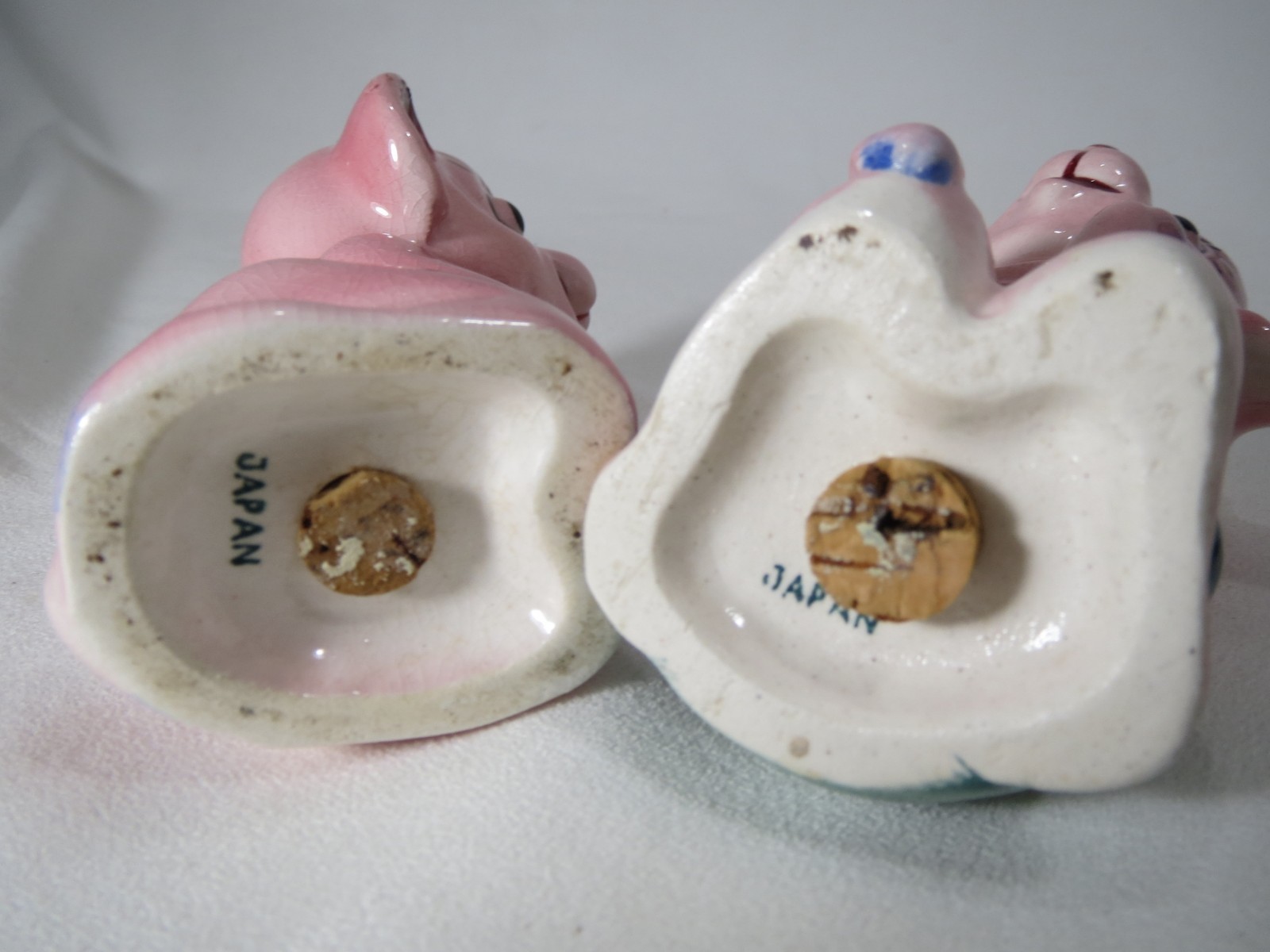 If you love S P's, cows, pink or just cute things, then this will certainly add to your collection, and will be sure to bring a smile every time someone looks at them. They remind me of ELSIE the cow, and maybe they are, however was not able to find any others like it to know for sure. Is a couple of ADORABLE piglets, with cork as the stoppers. Don't think they were ever used, and was for display only.