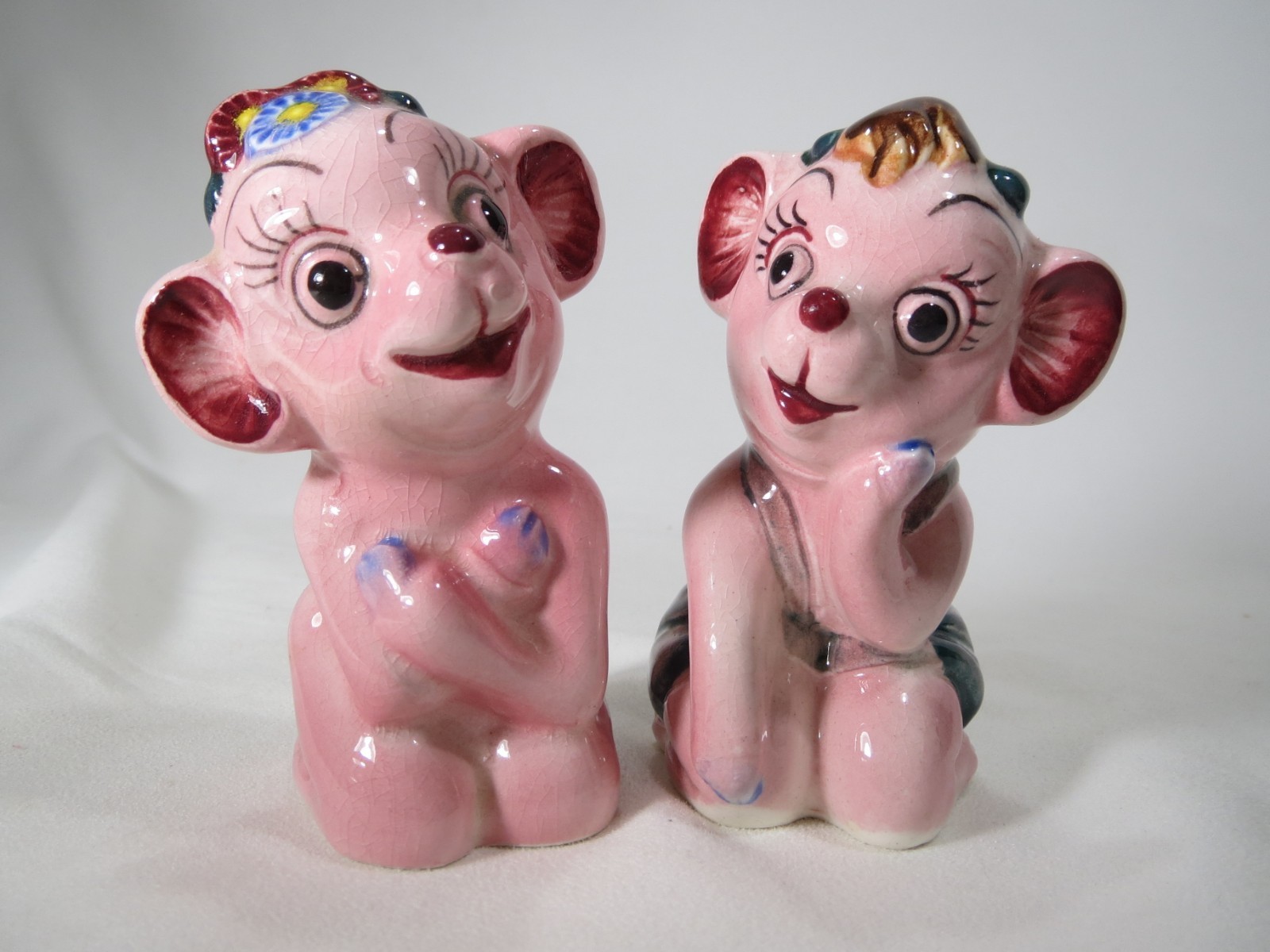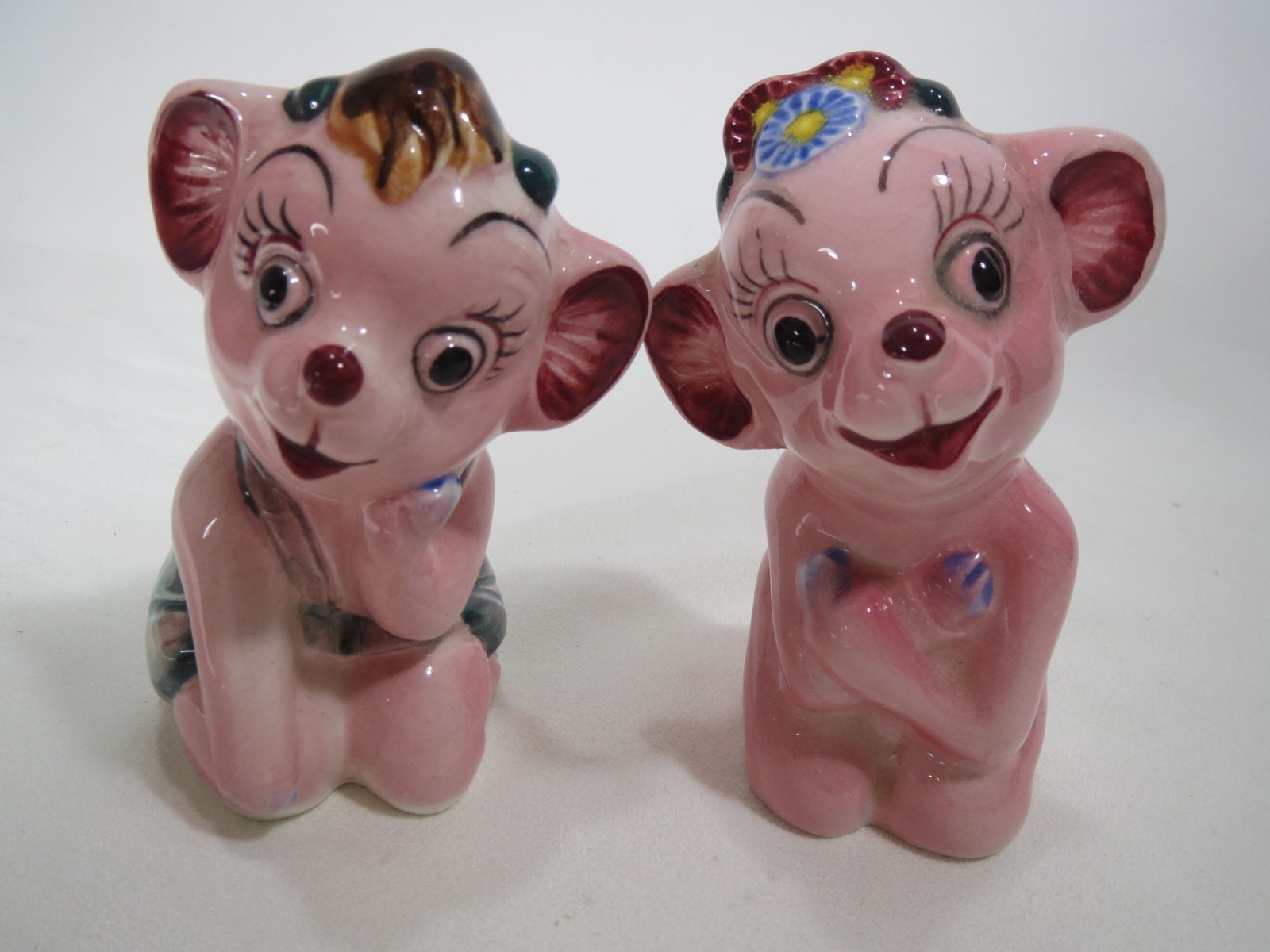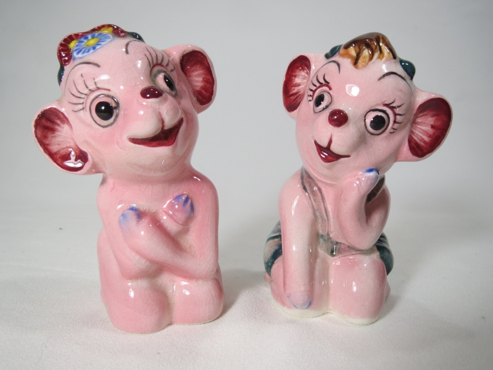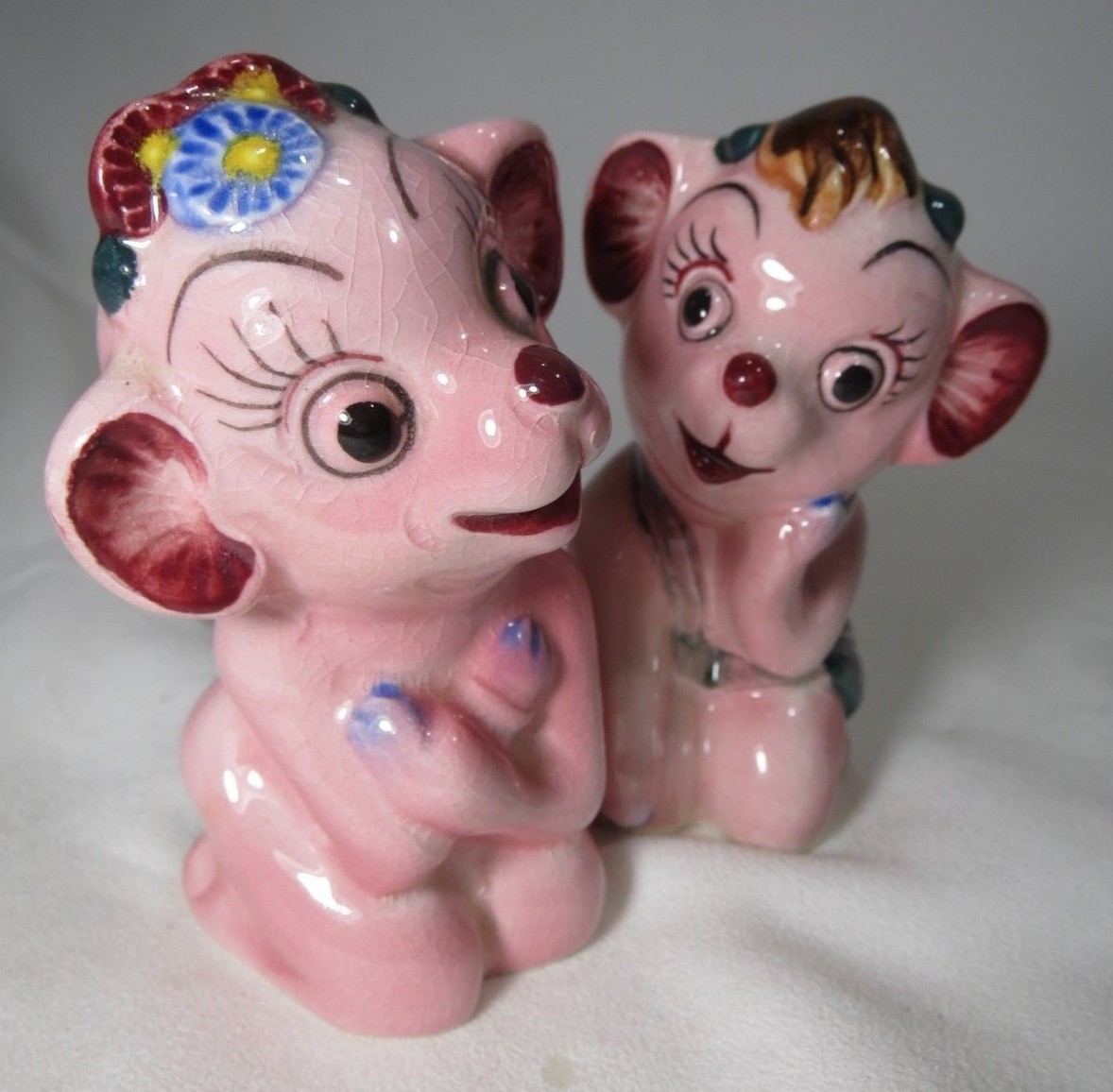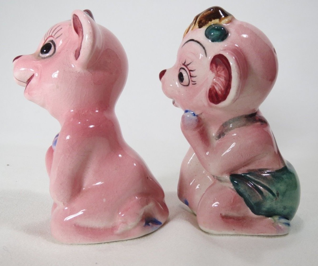 If you love S P's, cows, pink or just cute things, then this will certainly add to your collection, and will be sure to bring a smile every time someone looks at them. They remind me of ELSIE the cow, and maybe they are, however was not able to find any others like it to know for sure. Is a couple of ADORABLE piglets, with cork as the stoppers. Don't think they were ever used, and was for display only.