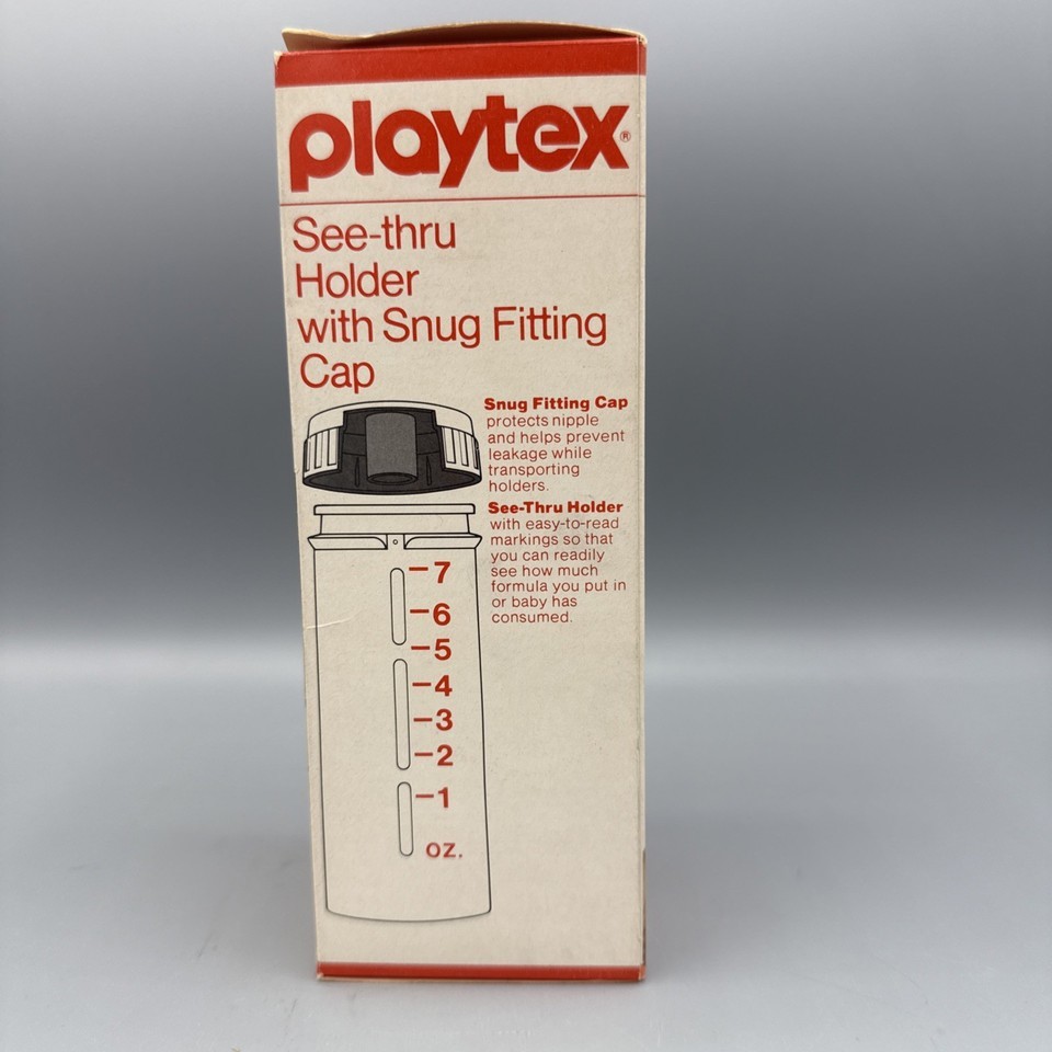 Vintage 19878 Playtex Baby See-thru Holder with Snug Fitting Cap. Made of clear plastic and manufactured in the United States, this one-piece bottle features a unique design that includes a snug fitting cap to prevent leaks. Vintage product for display or prop. See pictures for details.