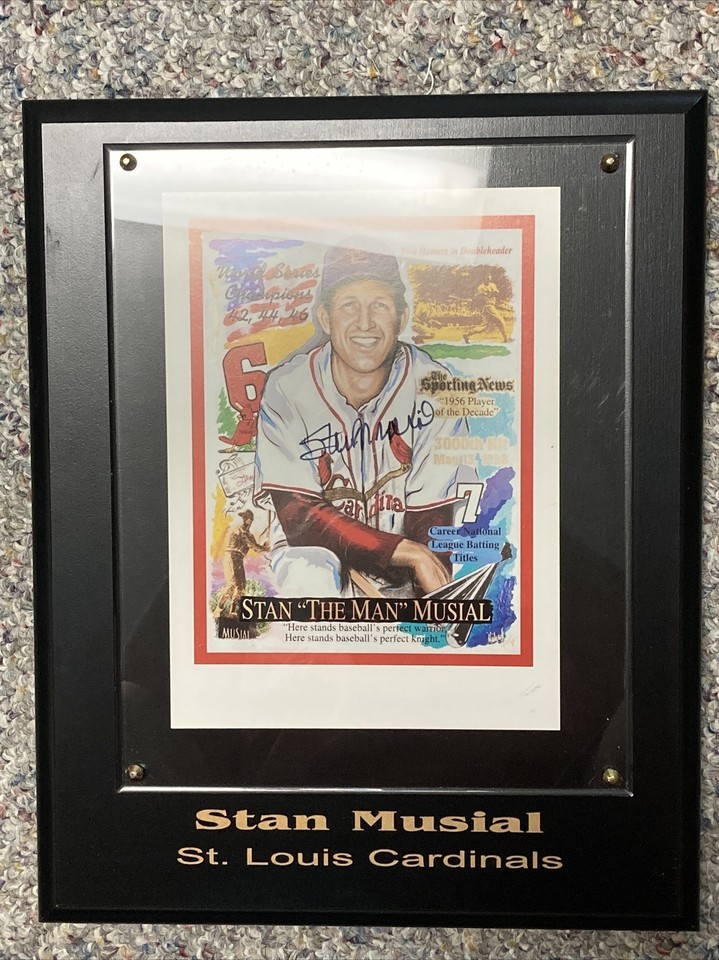 Poster card is 6 inches wide and 9.5 inches long. Signed by Stan Musial. No COA as this was purchased at an estate sale in St Louis. This may be a product of Stan The Man Productions but not positive. Plenty of examples on various websites. Great gift for any true baseball fan. The wood frame is 10.5 inches x 13 inches.