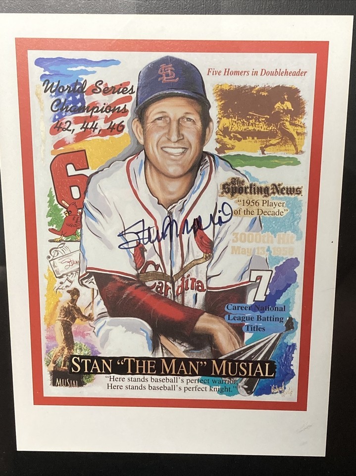Stan Musial Signed Cardinals Autographed HOF Baseball Art Poster Card Framed.